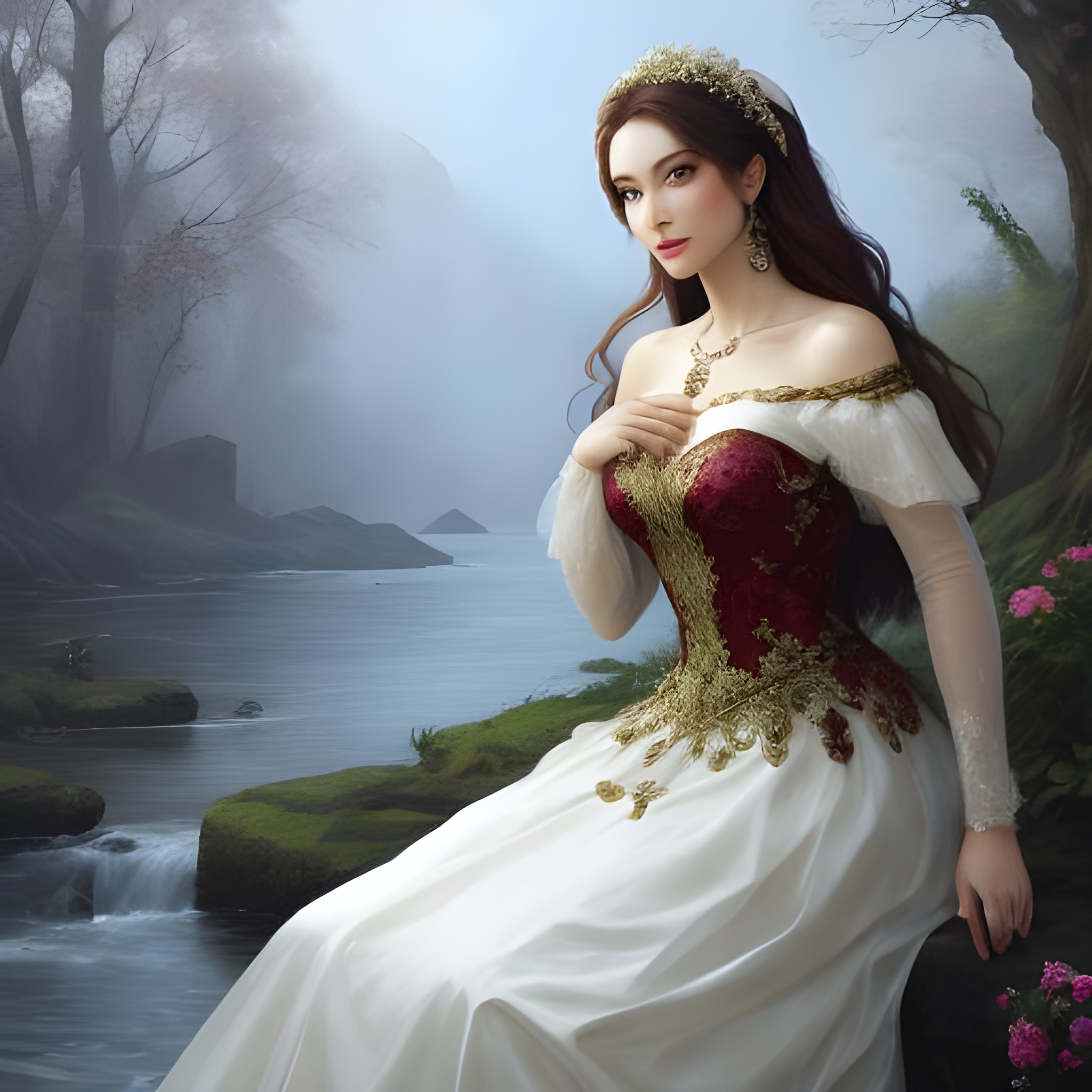In the ethereal tranquility of a cool morning, a captivating tableau unfolds by the river’s lush embrace. A woman, draped in a flowing garment, stands serenely on the verdant riverbank. The soft hues of dawn illuminate her silhouette, casting a gentle glow on the landscape. Wisps of mist rise from the tranquil waters, creating an enchanting atmosphere. The river, adorned with reflections of overhanging foliage, mirrors the serene beauty of the moment. The woman’s contemplative gaze is drawn towards the horizon, as the morning light bathes the scene in a sublime, diffused radiance, creating a timeless and poetic connection between her and the serene natural surroundings.
