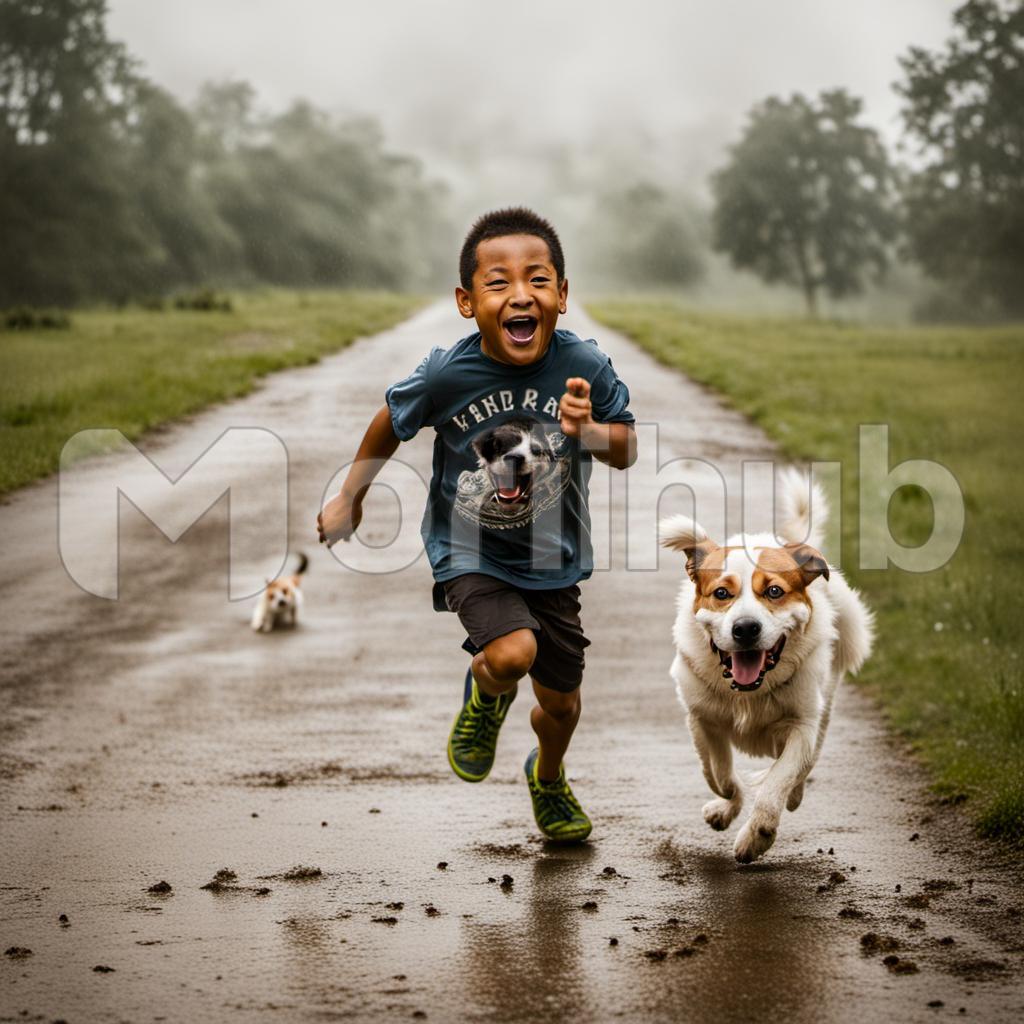On an idyllic day, the joyous laughter of a young boy reverberates as he sprints down an empty road, chasing after his exuberant pet dog. The fluffy companion, ears flapping in the wind, leads the playful pursuit, a symphony of youthful energy and canine delight. A second dog, equally enthralled, bounds gleefully behind the boy. The road stretches ahead, a canvas of endless possibilities under the gentle embrace of a cloudy sky. Their camaraderie paints a heartwarming scene, a snapshot of carefree moments and boundless joy. Amidst the simplicity of the open road and the backdrop of cloudy skies, the trio embodies the sheer magic of childhood adventures and the timeless connection between a child and his loyal four-legged companions.
