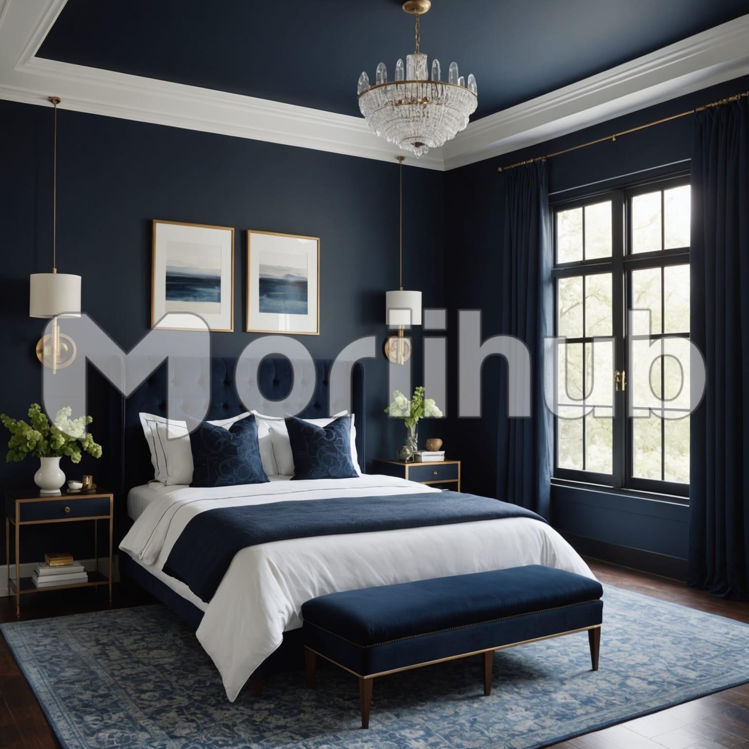 In the bedroom, the walls are painted in a soothing dark blue, creating a cocoon of calmness. Flanking the bed, potted plants on elegant stands bring a touch of nature indoors, their greenery contrasting beautifully with the deep hue. Above the bed, art frames hang in a curated display, adding personality and warmth to the space. Soft light filters through curtains, casting gentle shadows and highlighting the serene atmosphere. It’s a tranquil retreat where the blend of natural elements and artistic touches creates a harmonious and inviting ambiance.