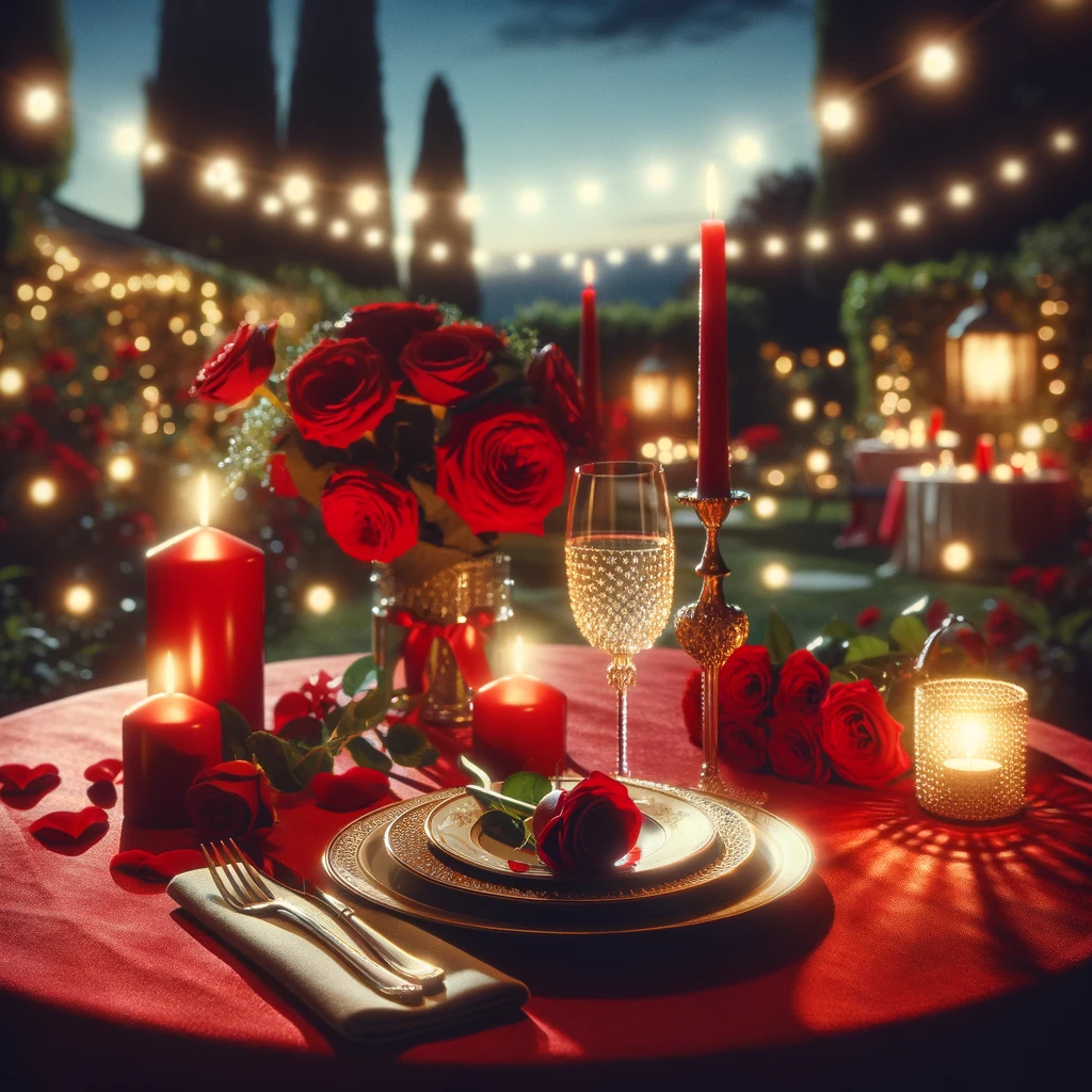 In a cozy corner, romance flourishes amidst a sea of red hues. A small table, adorned with a sumptuous red tablecloth, awaits two souls entwined in love. Soft candlelight flickers, casting a warm glow on the scene. Roses, crimson and passionate, grace the setting, their fragrance intoxicating. It’s a rendezvous painted in the colors of passion and affection.