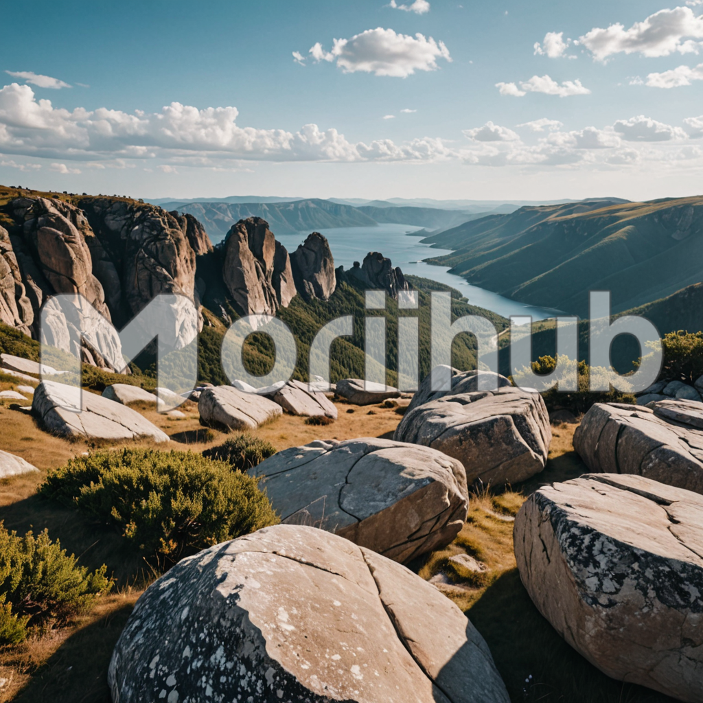In the vast expanse of rocky grassland, a winding river meanders through the rugged terrain, its gentle currents carving a path amidst the rocks. Along its banks, lush greenery flourishes, providing a vibrant contrast to the weathered landscape. Above, the sky is adorned with billowing clouds, casting shifting shadows upon the earth below. Despite the harshness of the rocky terrain, life thrives, finding nourishment in the fertile soil and cool waters. Against the backdrop of the cloudy sky, nature’s resilience and beauty are on full display.