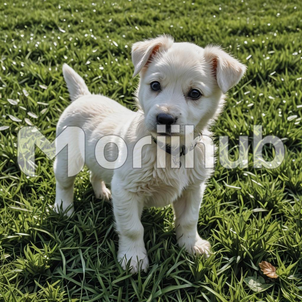 A white puppy with fluffy fur runs joyfully across a green grassy field, its small paws kicking up the soft grass. The puppy’s playful energy and happy expression create a heartwarming and lively scene.