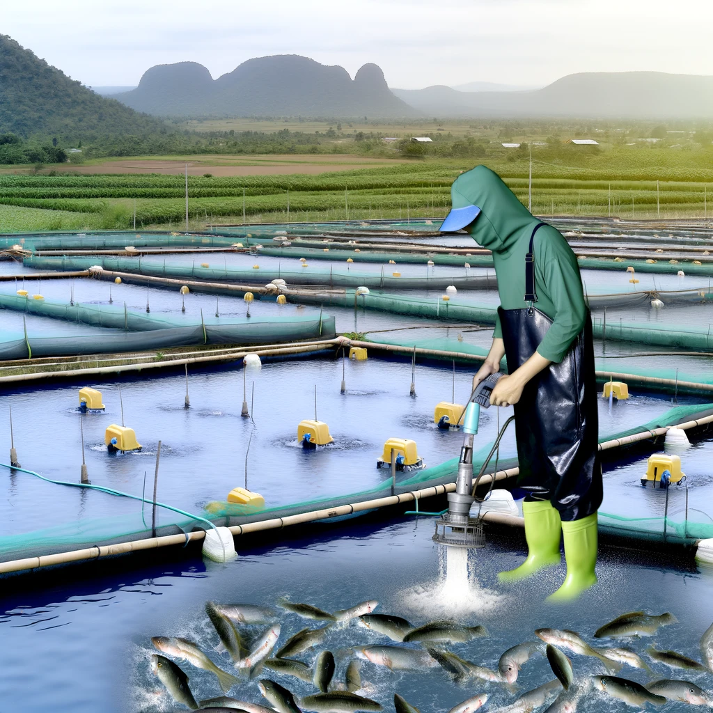 In this vivid scene, a fish farmer meticulously tends to their aquaculture farm, enveloped by the vast expanse of water. Clad in sturdy waterproof gear, they navigate the array of tanks and ponds with expertise. With focused determination, they feed, monitor, and maintain the health of the fish, embodying the dedication and diligence required in aquaculture. The backdrop showcases the sprawling network of ponds and tanks, a testament to the farmer’s commitment to sustainable fish farming practices.
