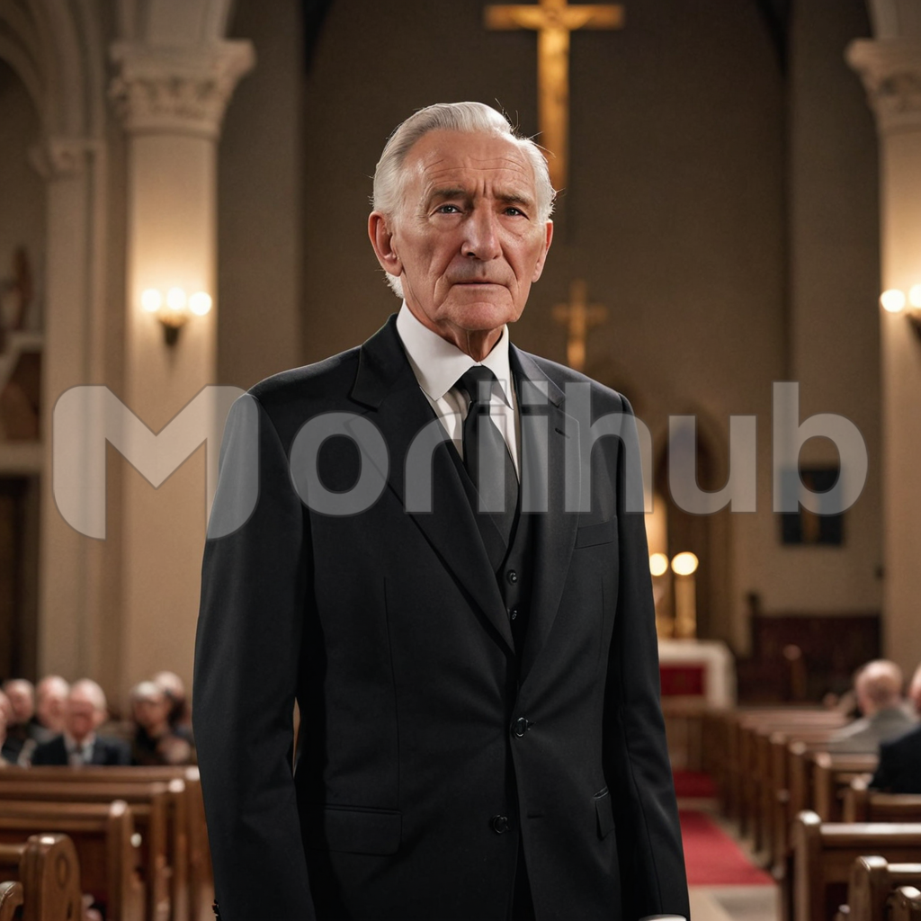 An elderly man stood stoically, his weathered face turned towards the distant horizon, lost in contemplation. His eyes, though aged, held a glimmer of wisdom and resilience. Behind him, scattered figures sat on polished wooden pews, their presence lending an air of solemnity to the scene. Despite the passing of time, the man’s unwavering gaze seemed to pierce through the present, perhaps seeking solace or finding solace in the depths of memory.