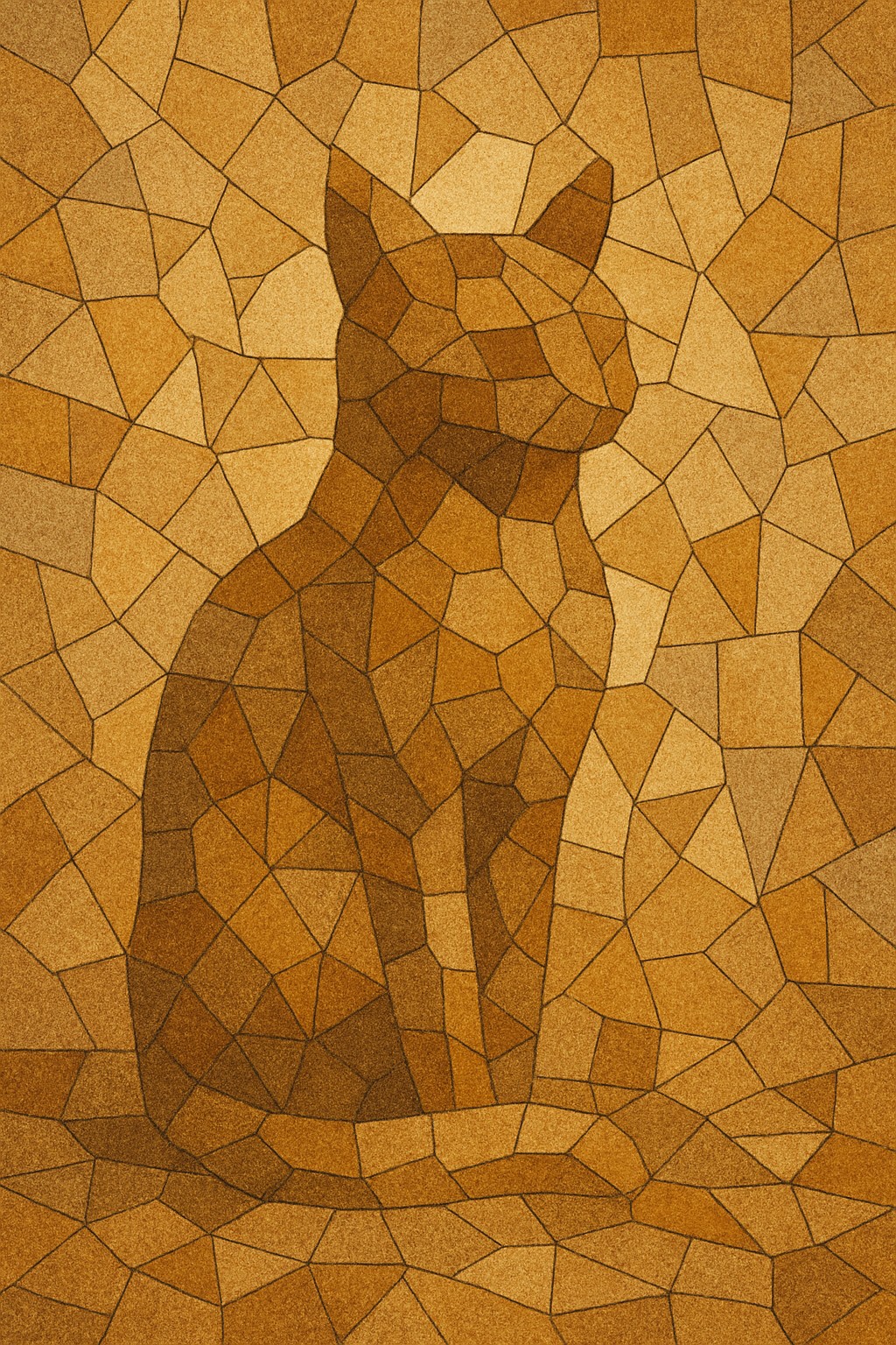 This image is a digital abstract mosaic in the shape of a cat, created using geometric shapes like triangles and polygons. The entire mosaic is designed in a sand-inspired palette, featuring tones of beige, golden brown, and tan, giving it a warm, earthy aesthetic. The cat’s silhouette is composed of darker sand-hued segments, making it subtly stand out from the surrounding background.