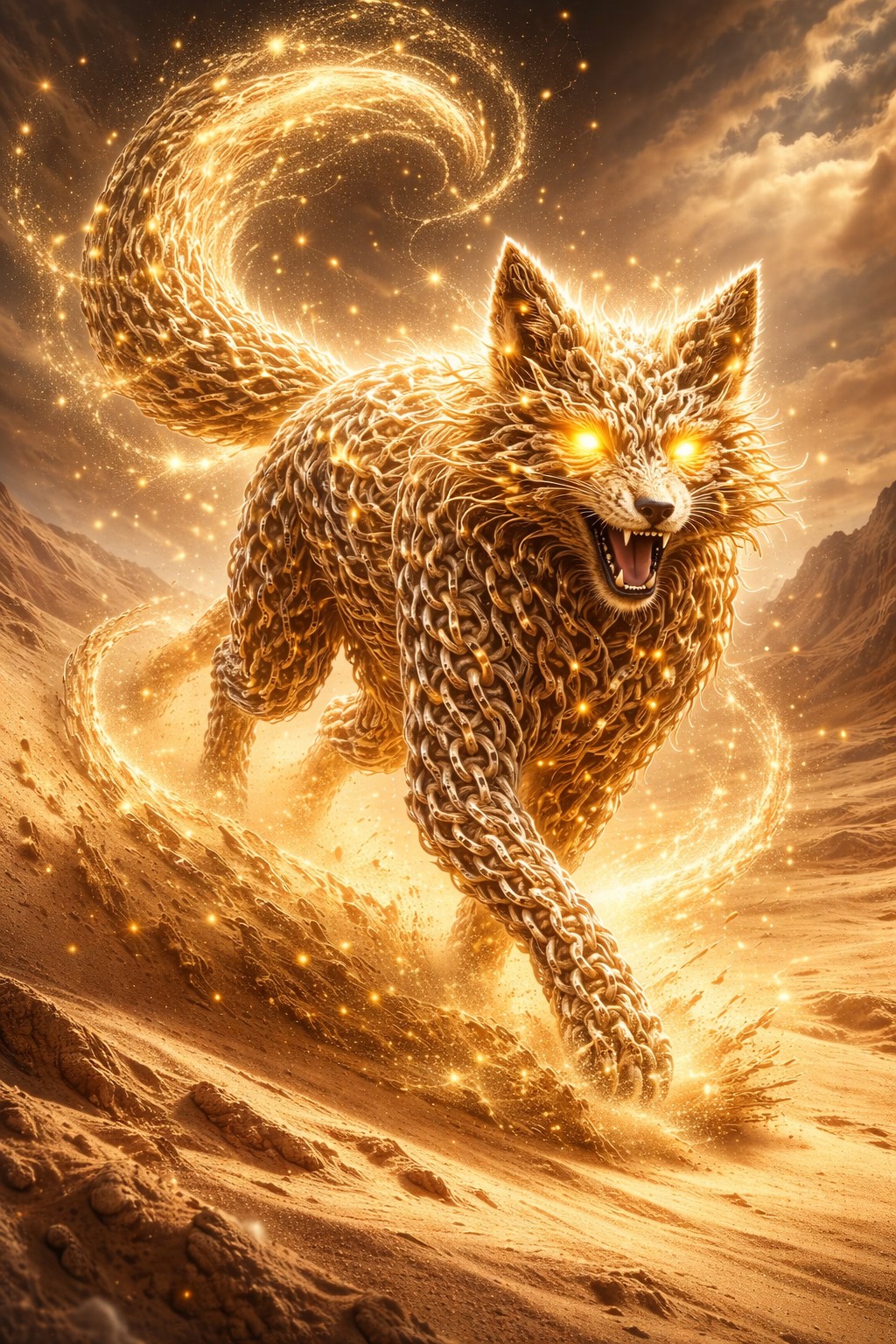The sand-forged fox emerges as a living embodiment of the desert’s will, its body formed from countless interlinked chains that resemble molten gold and drifting grains of sand. Each movement sends shimmering particles into the air, as if the creature is constantly assembling and dissolving at once. Its glowing amber eyes burn with ancient elemental power, casting warm light across its sharp, cunning features.