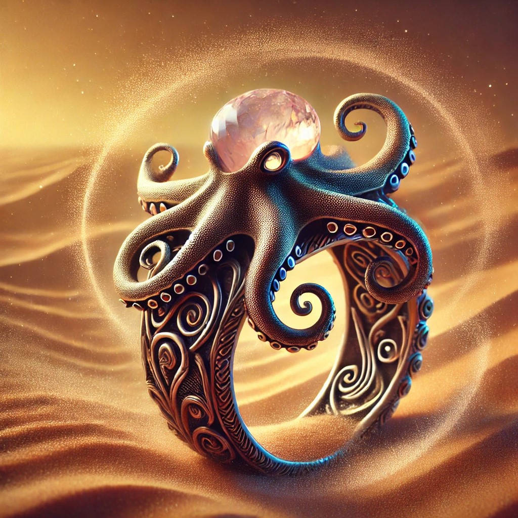 A mystical ring with a gemstone shaped like an octopus, crafted from swirling grains of sand. The octopus’s eyes glow softly, exuding mystery and power. The band is engraved with intricate tentacle and ocean current patterns, symbolizing intelligence and adaptability. A gentle sandstorm swirls around the ring, as if the octopus’s spirit is alive, its tentacles coiling fluidly through the sands.