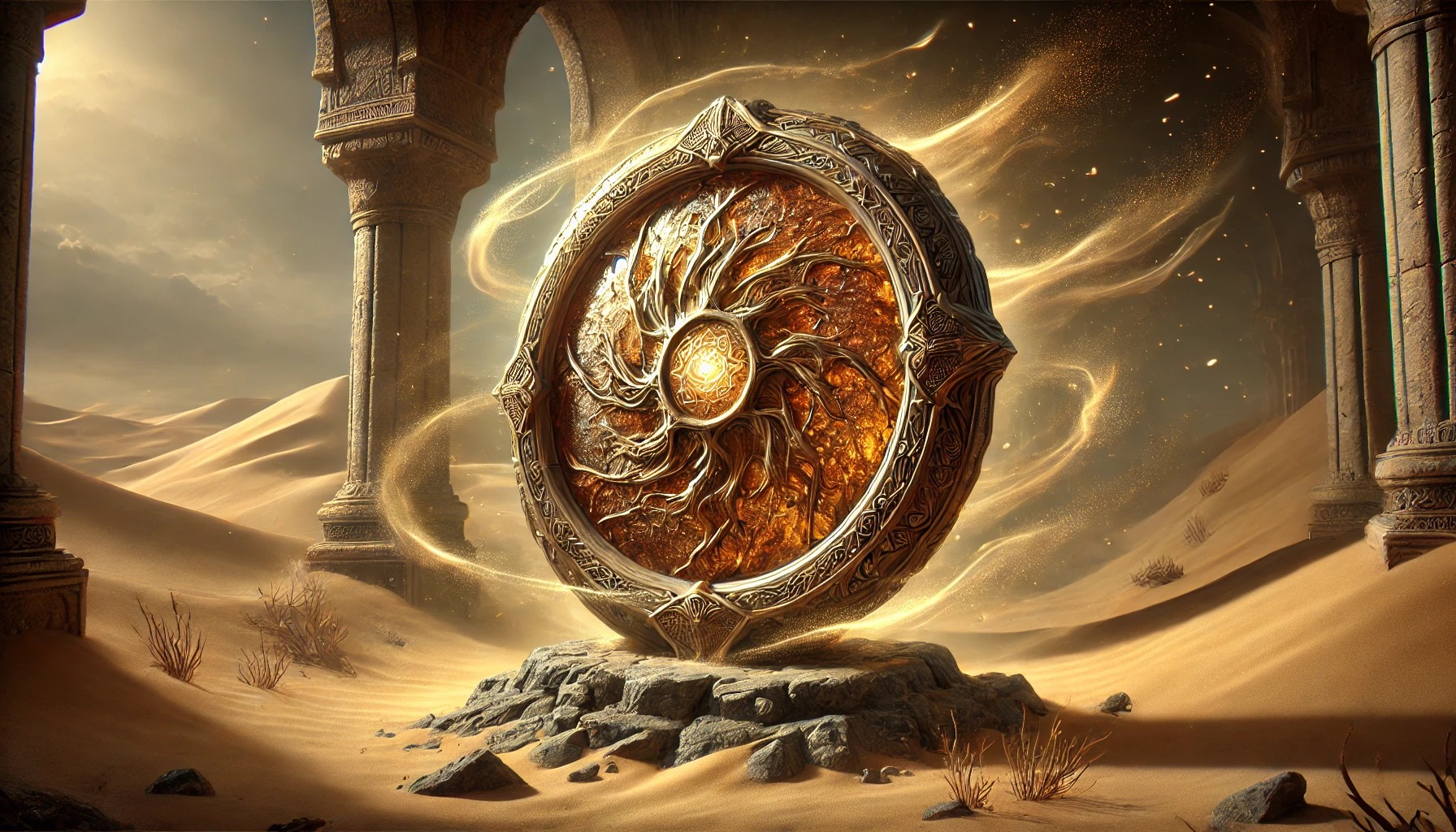 The Crystal Shield of Shifting Sands is an ancient and mystical artifact, crafted from translucent golden-brown crystal, resembling solidified desert glass. Within its surface, enchanted grains of sand swirl endlessly, forming intricate, ever-changing patterns as if alive. The edges of the shield are jagged yet smooth, sculpted by unseen desert winds, giving it the appearance of a relic shaped by time itself.