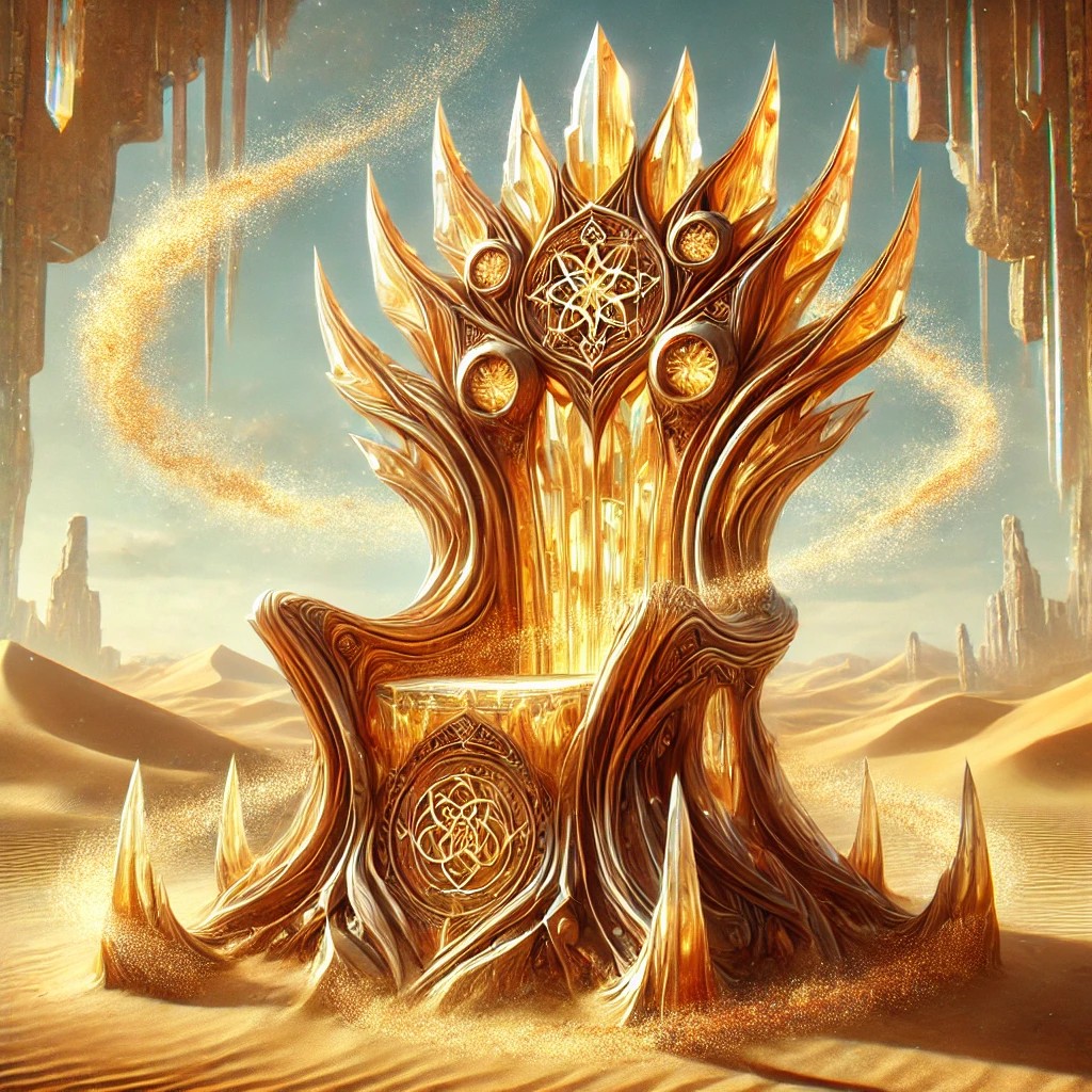 A grand crystalline throne, sculpted from translucent golden-brown crystal, rises from the heart of an endless desert. The crystal shimmers like sunlit desert sands, its surface embedded with glowing golden grains of sand that swirl slowly within, as if suspended in time. The throne’s frame is adorned with ancient carvings of dunes, swirling sands, and mystical desert symbols, telling the story of an age-old kingdom buried beneath the sands.