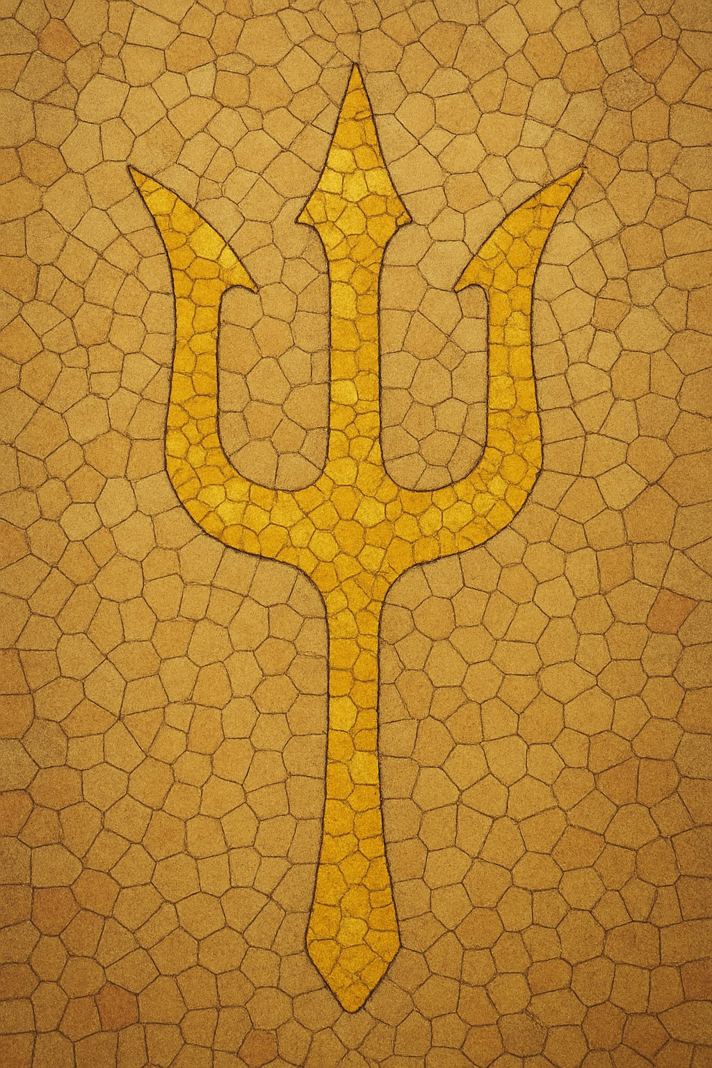 This image features a digital abstract mosaic shaped like a trident, with a strong connection to the sand element. The trident is crafted from small, irregular, tessellated pieces resembling stained glass or cracked earth, all in golden yellow and warm brown hues. The background continues the mosaic pattern in a deeper sandy tone, giving the entire image a cohesive, earthy, and elemental feel.