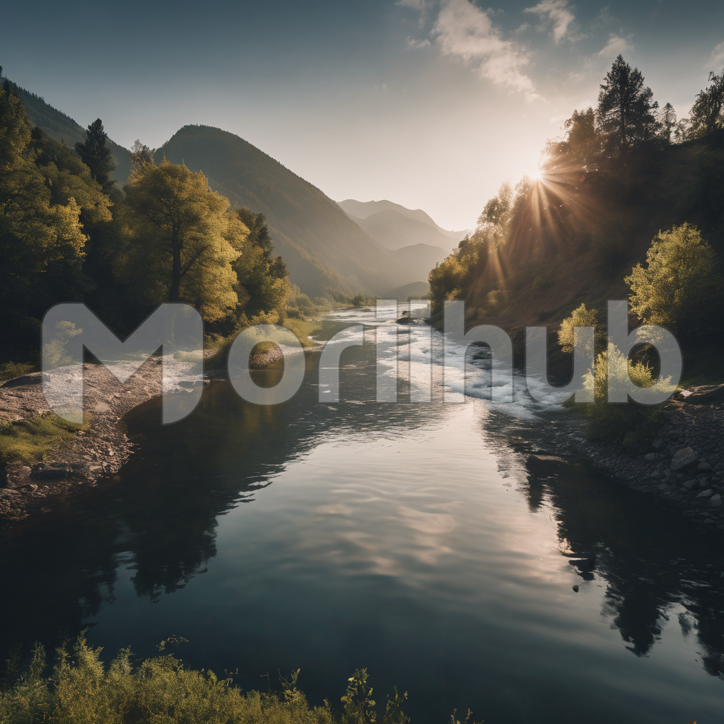 A serpentine river gracefully winds through a tapestry of lush greenery, casting reflections of vibrant foliage. In the distance, a majestic mountain stands sentinel, its silhouette against a muted grey sky. Nature’s symphony unfolds as the river’s gentle flow harmonizes with the serene expanse, creating a picturesque scene. The contrasting hues of greenery and the subdued sky weave a tranquil narrative, inviting contemplation in the embrace of this scenic river valley.