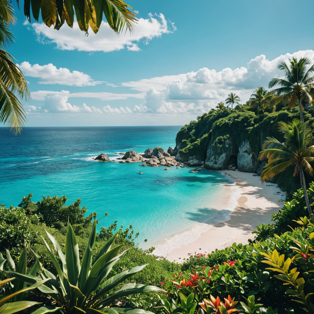 At the edge of a pristine white sand beach, verdant greenery thrives amidst the shifting sands. Towering palms sway gently in the breeze, their emerald fronds contrasting with the powdery shore. Overhead, fluffy clouds obscure the sun, casting a soft, diffuse light over the tranquil scene. Nature’s symphony plays out in harmony, as the lush foliage and sandy expanse create a serene oasis amidst the cloudy skies, inviting moments of peaceful contemplation.