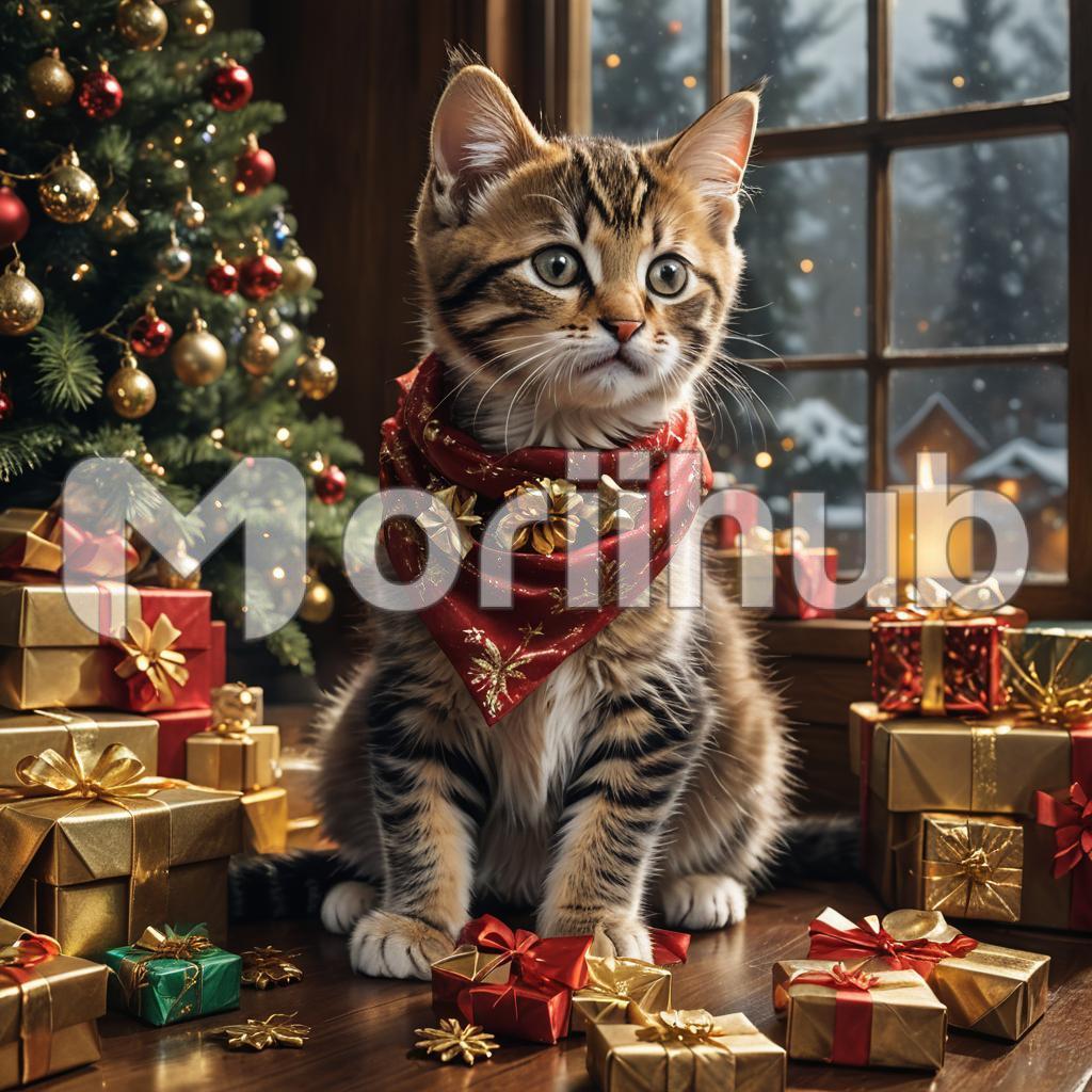 The dress is adorned with holiday-themed patterns—perhaps snowflakes, stars, or holly leaves—adding a touch of seasonal charm. The kitten’s soft fur contrasts beautifully with the rich colors of the dress, creating a heartwarming visual. Its big, curious eyes and small, twitching nose add to its endearing appearance. The kitten seems perfectly content, nestled among the folds of the dress, as if it’s part of the festive celebration. The combination of the kitten’s adorable presence and the cheerful dress makes for a truly delightful sight.