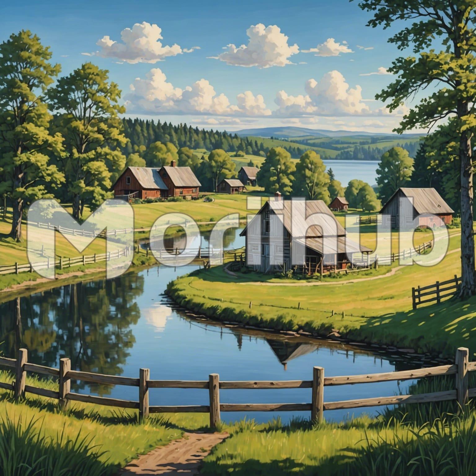 Surrounded by a rustic charm, tall trees encircle quaint cabins with weathered exteriors. A wooden fence follows the gentle curve of a serene lake, its posts weathered by wind and time, blending harmoniously with the natural surroundings. The tranquil waters mirror the sky’s hues, serene and undisturbed, reflecting the cabins and the trees that stand sentinel nearby. This idyllic scene evokes a sense of peaceful seclusion, where nature and human habitation coexist in perfect rustic harmony, undisturbed by the passage of time.