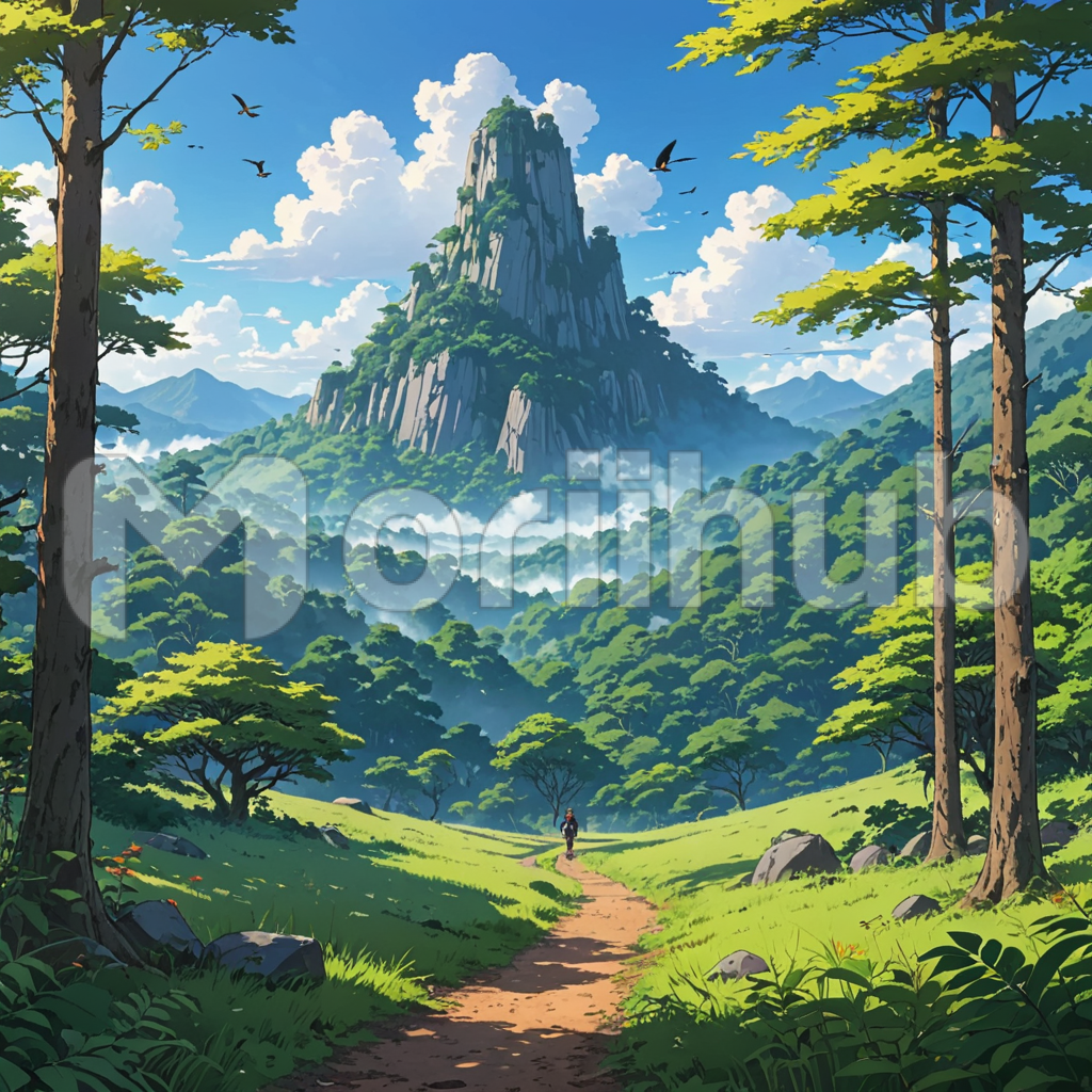 Within the lush woods, a winding path beckons, leading towards the towering presence of a distant mountain. The verdant foliage envelops the trail, whispering secrets of ancient wisdom and tranquility. Above, the sky hangs heavy with billowing clouds, casting a soft, diffused light upon the scene below. Along the path, a solitary figure strides purposefully towards the mountain’s silhouette, their silhouette merging with the landscape’s natural allure. In this serene setting, nature’s beauty merges with the anticipation of exploration, inviting the wanderer to venture forth into the unknown.
