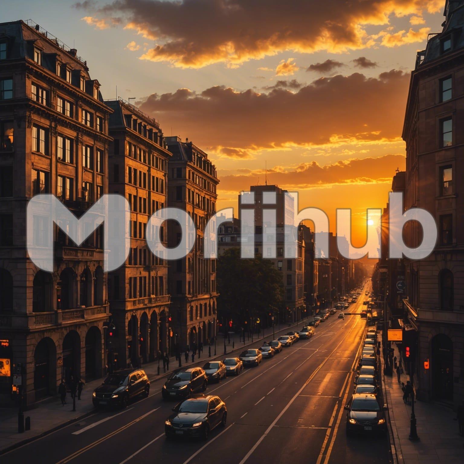 A cityscape unfolds under the warm hues of a sunset, casting a golden glow over the scene. Cars are parked neatly along the curb, their polished surfaces reflecting the fading light. Tall buildings line the streets, their windows shimmering with the last rays of the sun. The sky transitions through a spectrum of hues, creating a breathtaking backdrop. The city, bathed in the serene glow of twilight, exudes a peaceful, almost magical ambiance. The overall scene captures the tranquil beauty of the city at dusk.