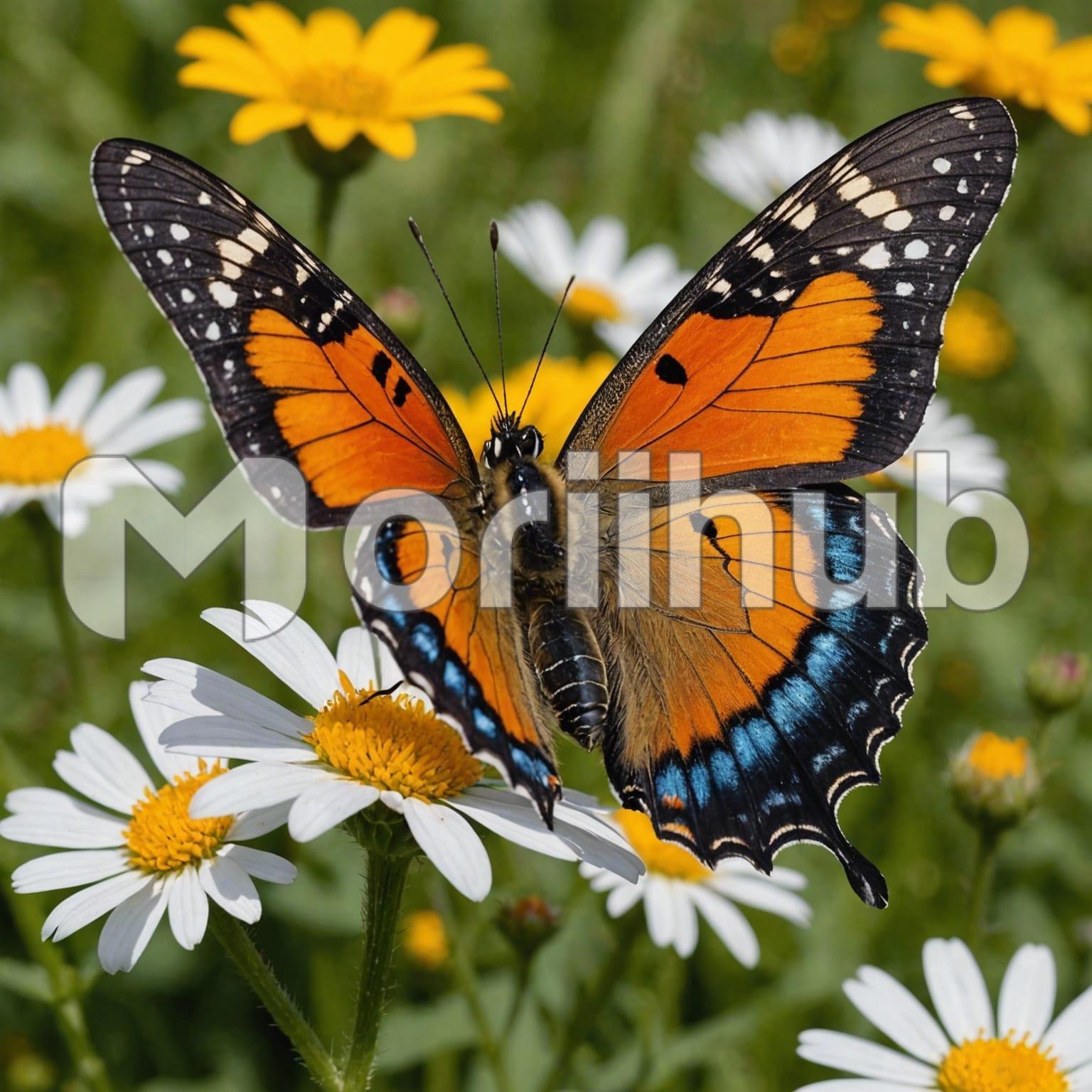 A butterfly delicately perches on a vibrant flower, its wings a kaleidoscope of colors. The gentle flutter of its wings contrasts with the stillness of the flower, creating a scene of natural harmony. The butterfly’s delicate legs grasp the flower’s petals as it sips nectar, its antennae twitching with each movement. The surrounding greenery enhances the beauty of this moment, a perfect blend of color and life. This serene interaction between the butterfly and the flower captures the essence of nature’s intricate and fleeting beauty.