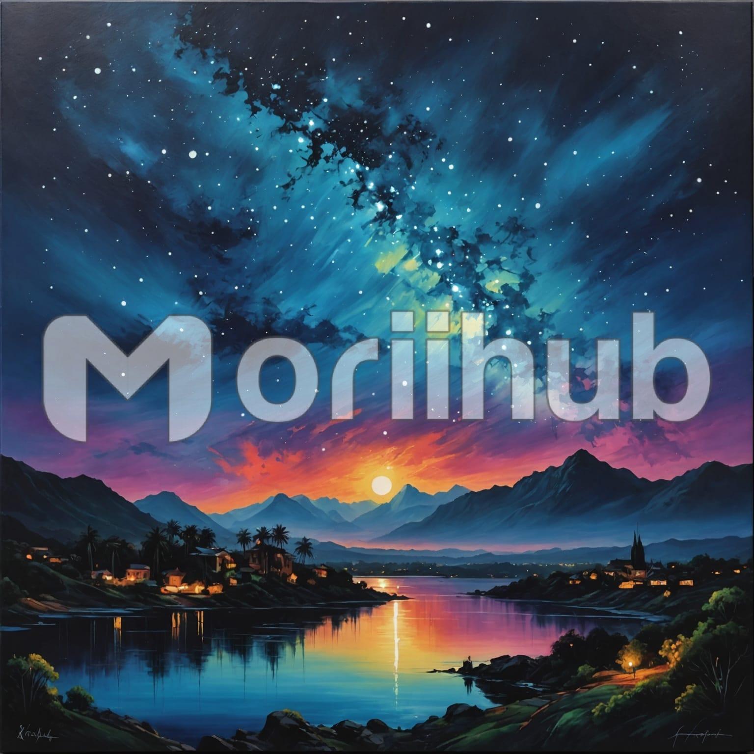An art painting captures a serene scene of a flowing river glistening under a starry night. The water shimmers as it meanders gently, reflecting the brilliance of countless stars above. In the foreground, majestic mountains rise, their silhouettes softened by the warm hues of a stunning sunset that casts a gentle glow across the sky. The mountains frame the river beautifully, creating a sense of depth and tranquility. This enchanting landscape invites viewers to lose themselves in its peaceful ambiance and the beauty of nature.
