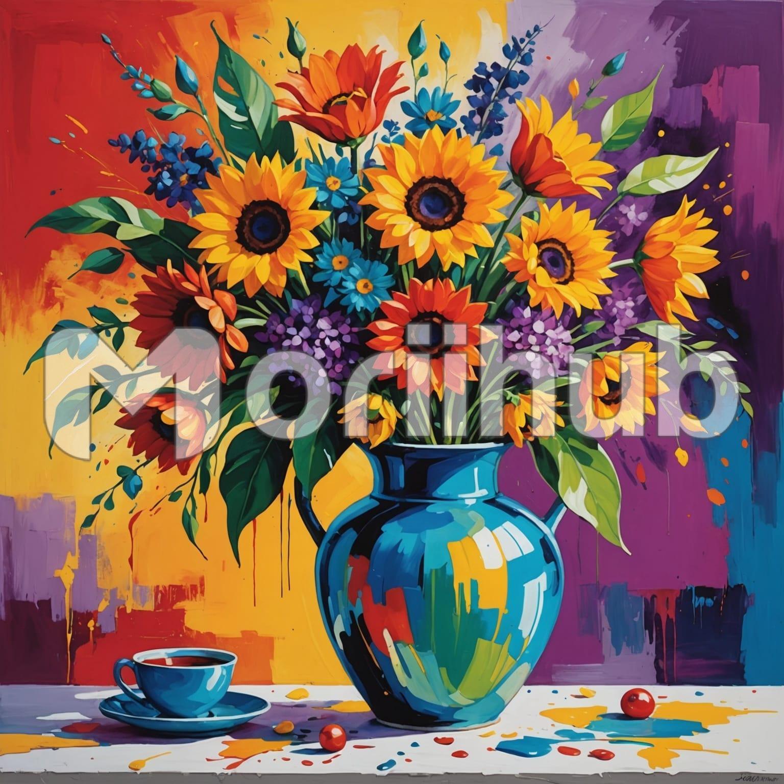 The vibrant painting captures a flower pot bursting with color, its blooms radiating joy and life. The petals are painted in rich hues, creating a striking contrast against the earthy tones of the pot. Beside it, a delicate teacup rests on a matching saucer, inviting viewers to imagine a moment of quiet reflection. The play of light adds depth to the scene, highlighting the textures of the flowers and the fine details of the teacup. This lively composition evokes a sense of warmth, beauty, and the simple pleasures of life.