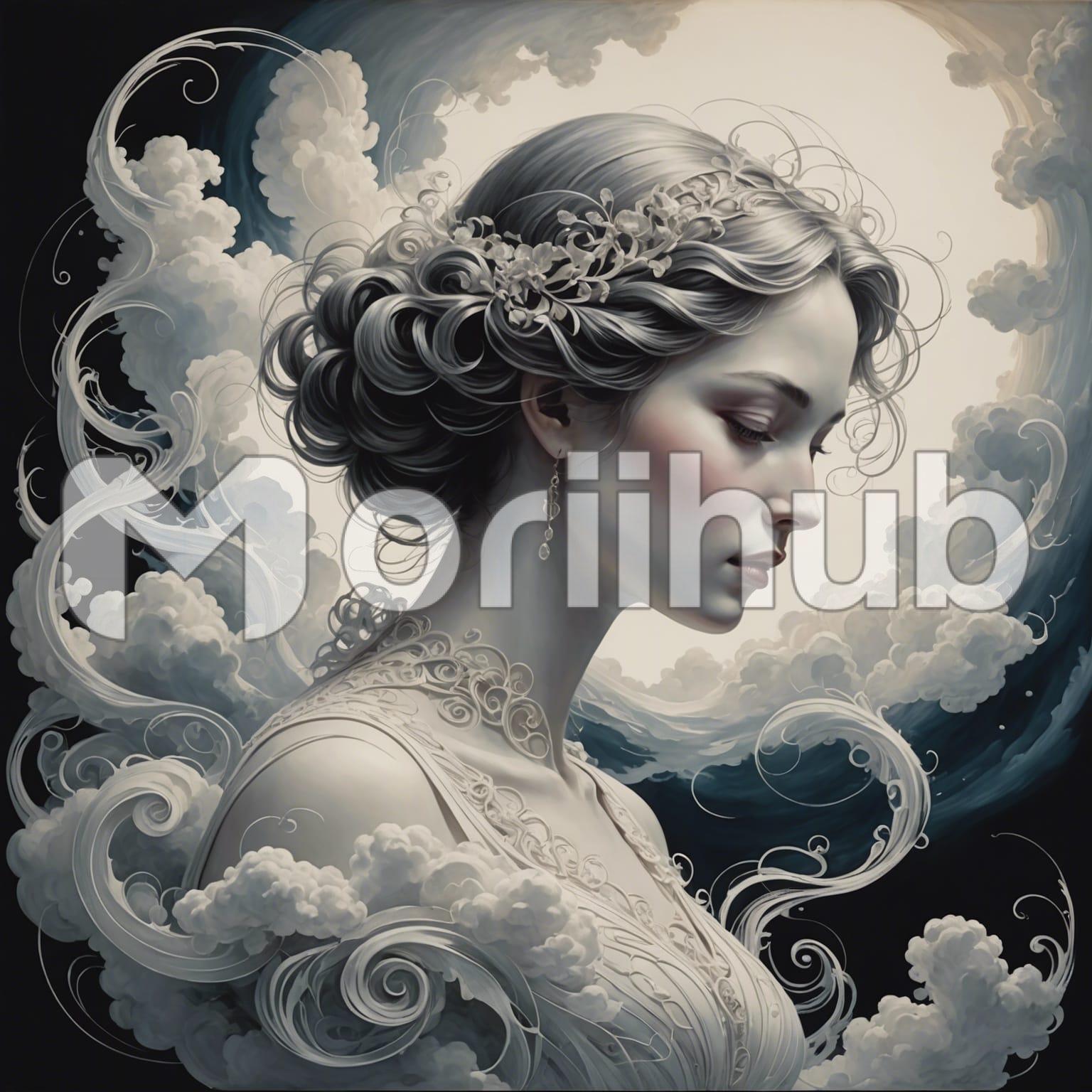 Amidst ethereal clouds, an exquisite artwork depicts the side profile of a woman. Her features are delicate, framed by cascading curls adorned with a floral laurel, adding a touch of natural elegance. Soft hues blend seamlessly, enhancing the ethereal aura surrounding her. With her gaze directed into the distance, she exudes a sense of tranquility and grace. The artist’s skillful strokes capture not just her physical beauty, but also the intangible essence of femininity and serenity, evoking a sense of wonder and admiration.