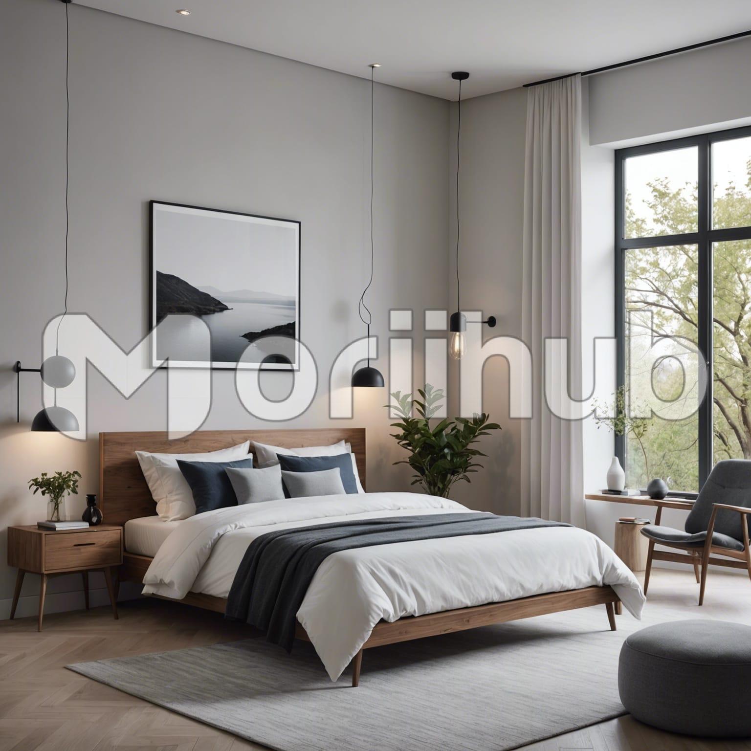 In the tranquil embrace of a bedroom, a potted plant thrives in a corner, its verdant leaves adding a touch of nature’s charm. Lamps cast a soft glow, illuminating the space with gentle warmth. A chair nestled in another corner offers a cozy retreat for contemplation. Above the bedstand, art adorns the wall, adding character and personality to the room. Through the glass door, a view of lush trees invites serenity and connection to the outdoors, completing the tranquil ambiance of the space.