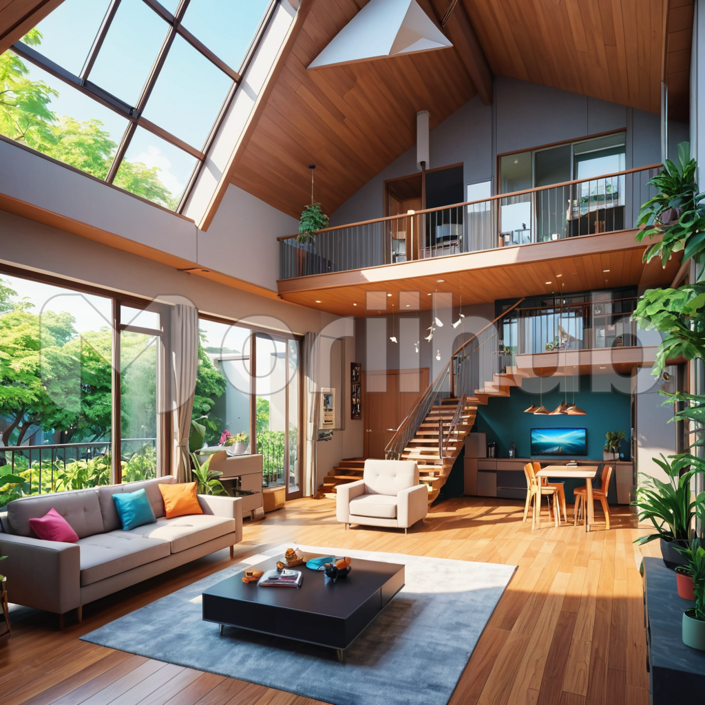 In the cozy living room, a plush couch beckons, inviting relaxation amidst modern elegance. Above, a glass corner ceiling reveals the sky and lush greenery, seamlessly blending indoors with nature’s splendor. Through the glass door, sunlight bathes the room, casting a warm glow upon the serene space. Here, comfort meets sophistication, offering a tranquil retreat where one can unwind while feeling connected to the beauty of the outdoors.
