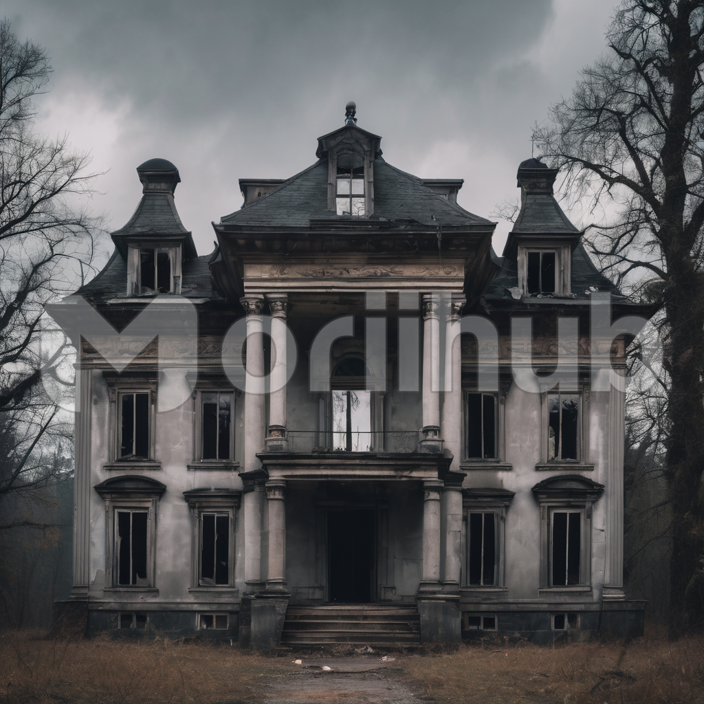 Beneath a solemn and ashen sky, an abandoned old house stands like a ghostly relic, its once-grand architecture now crumbling in decay. Surrounding the desolate structure are withered trees, their skeletal branches reaching for a sky that offers no respite. A sense of eerie quietude permeates the air, broken only by the occasional creaking of the house’s timeworn timbers. This forsaken dwelling, entwined with the withered trees, paints a haunting tableau of forgotten memories and the relentless march of time.