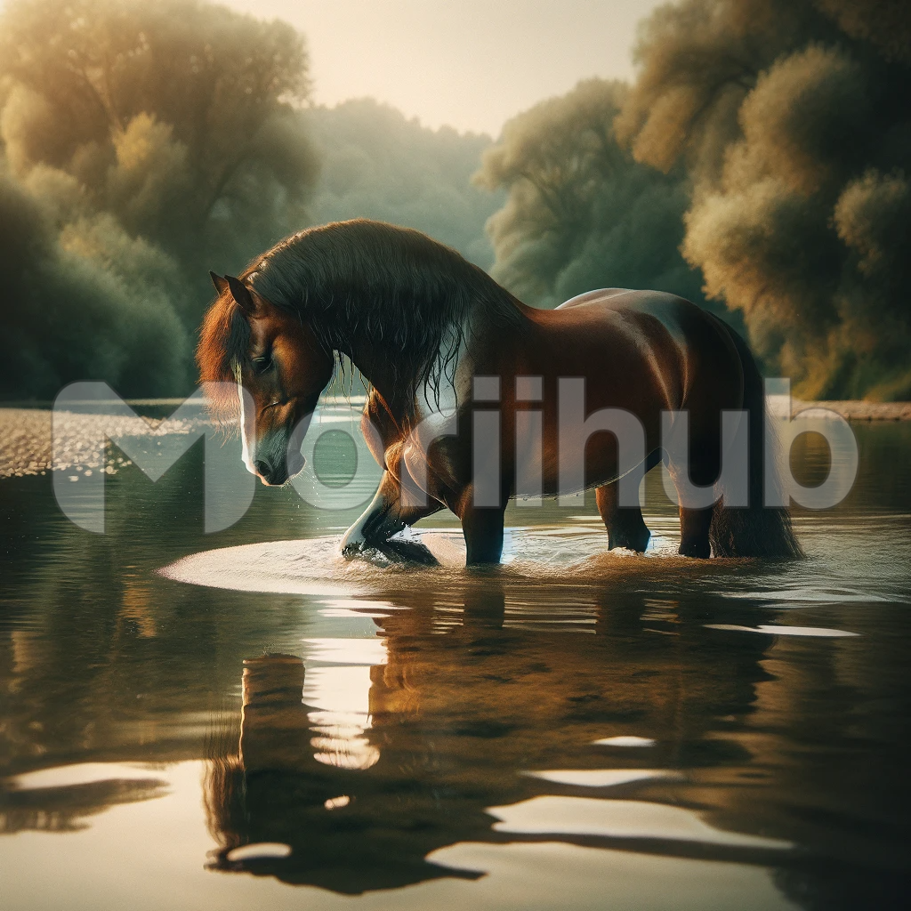 Amidst the serene backdrop of nature, a majestic horse stands regally in shallow water. Its coat gleams with a glossy sheen, catching the dappled sunlight. With a serene and content expression, it revels in the cool embrace of the water, surrounded by gentle ripples that mirror the tranquility of the moment. The harmonious union of this noble creature and the pristine environment evokes a sense of awe and reverence, a symbol of the untamed beauty of the natural world.