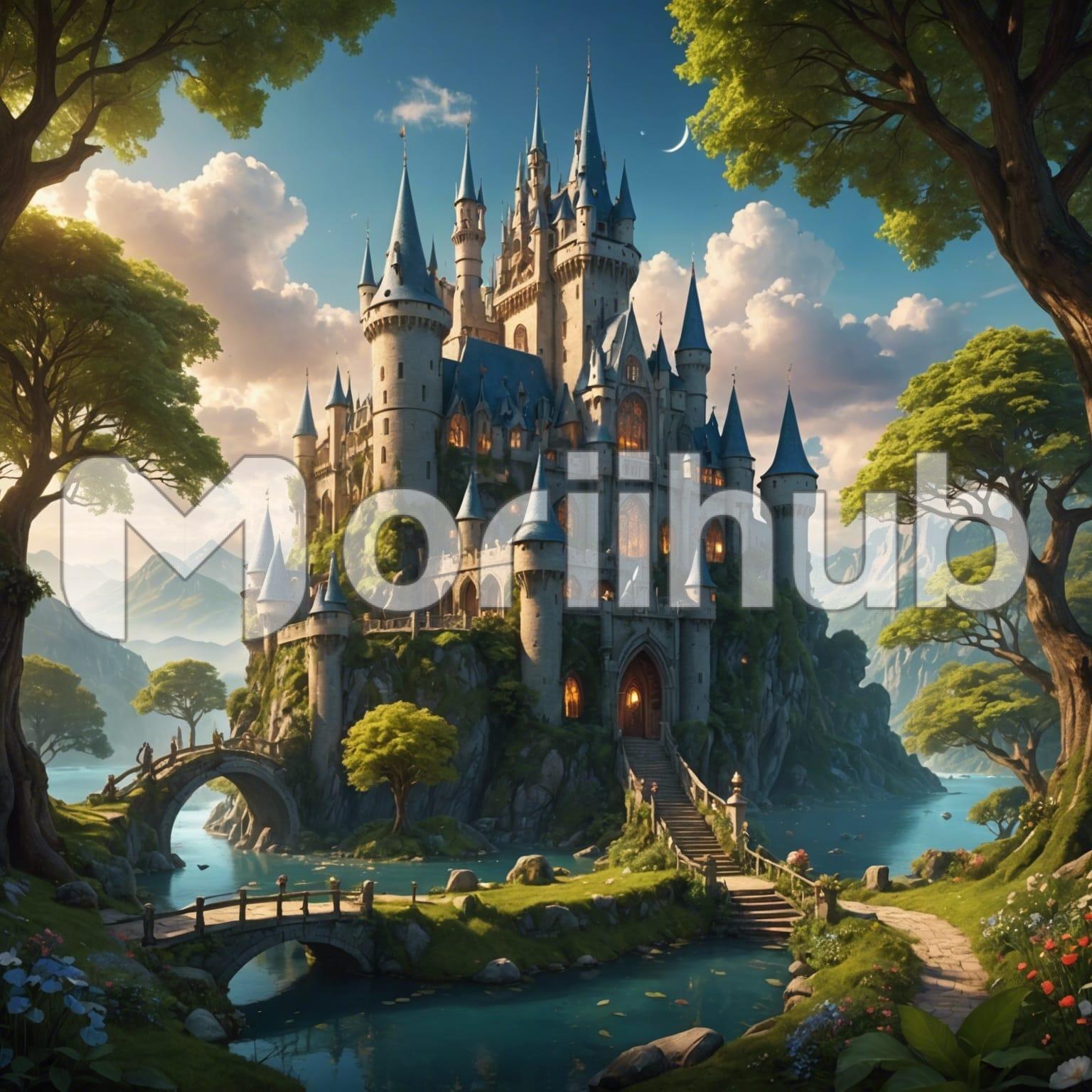 Rising from the crystalline depths, a fantasy castle perches atop clear waters, its majestic spires piercing the heavens. Surrounding it, a lush cloak of greenery envelops the landscape, a vibrant testament to nature’s enduring embrace. Towering clouds swirl overhead, casting fleeting shadows upon the scene below. The castle, adorned with intricate carvings and glistening with magic, stands as a beacon of wonder and enchantment in this ethereal realm. Against the backdrop of endless skies and serene waters, it becomes a symbol of timeless beauty and fantastical dreams.