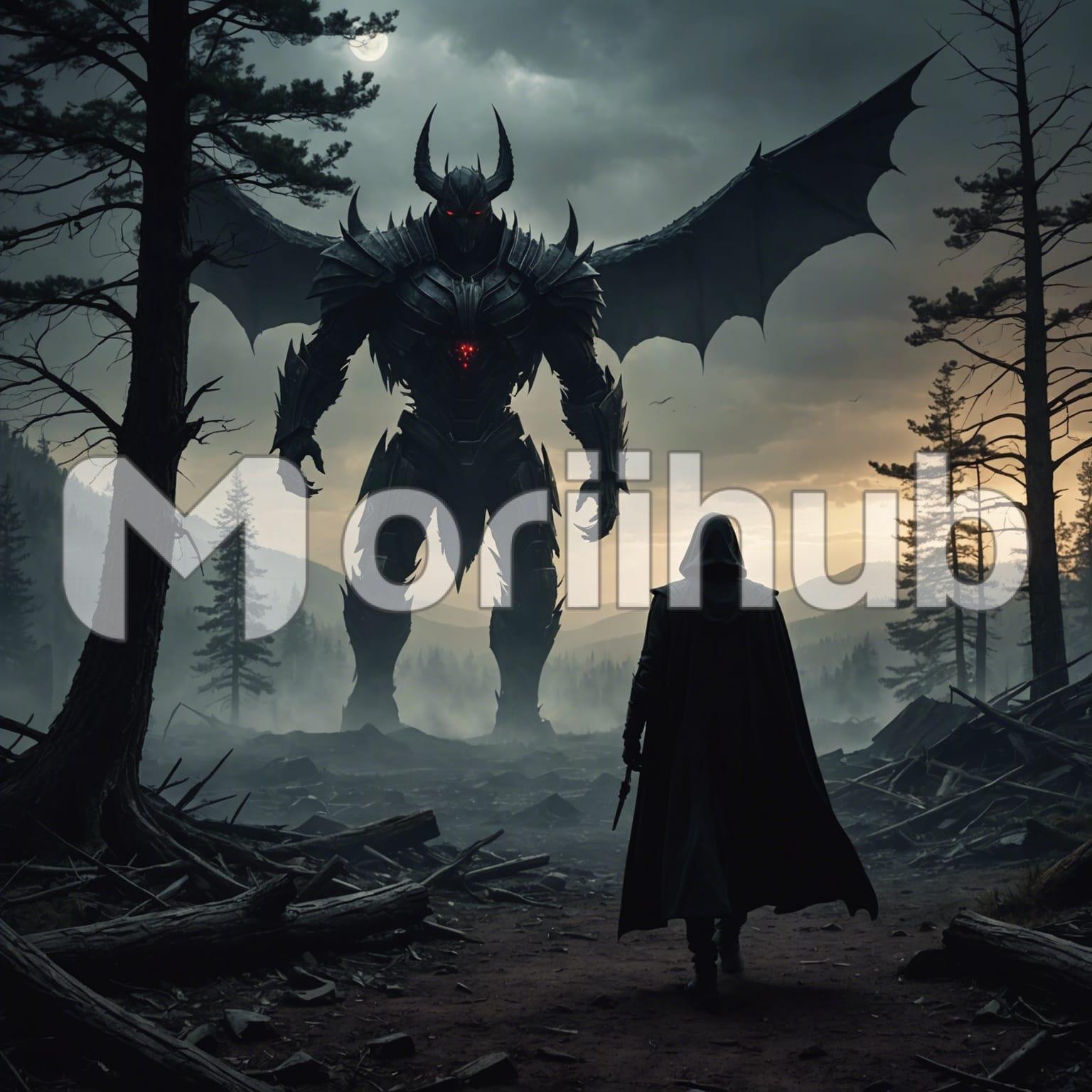 In the heart of a forest clearing, bathed in the eerie glow of moonlight, a cloaked figure stands tall, its back turned to the viewer. Before them looms a colossal creature, its massive wings unfurled in a menacing display. The figure exudes an aura of determination, poised for a confrontation with the unknown. Shadows dance around them, adding to the air of mystique and tension that permeates the scene. In this nocturnal battleground, a silent duel between darkness and destiny unfolds, shrouded in secrecy and anticipation.