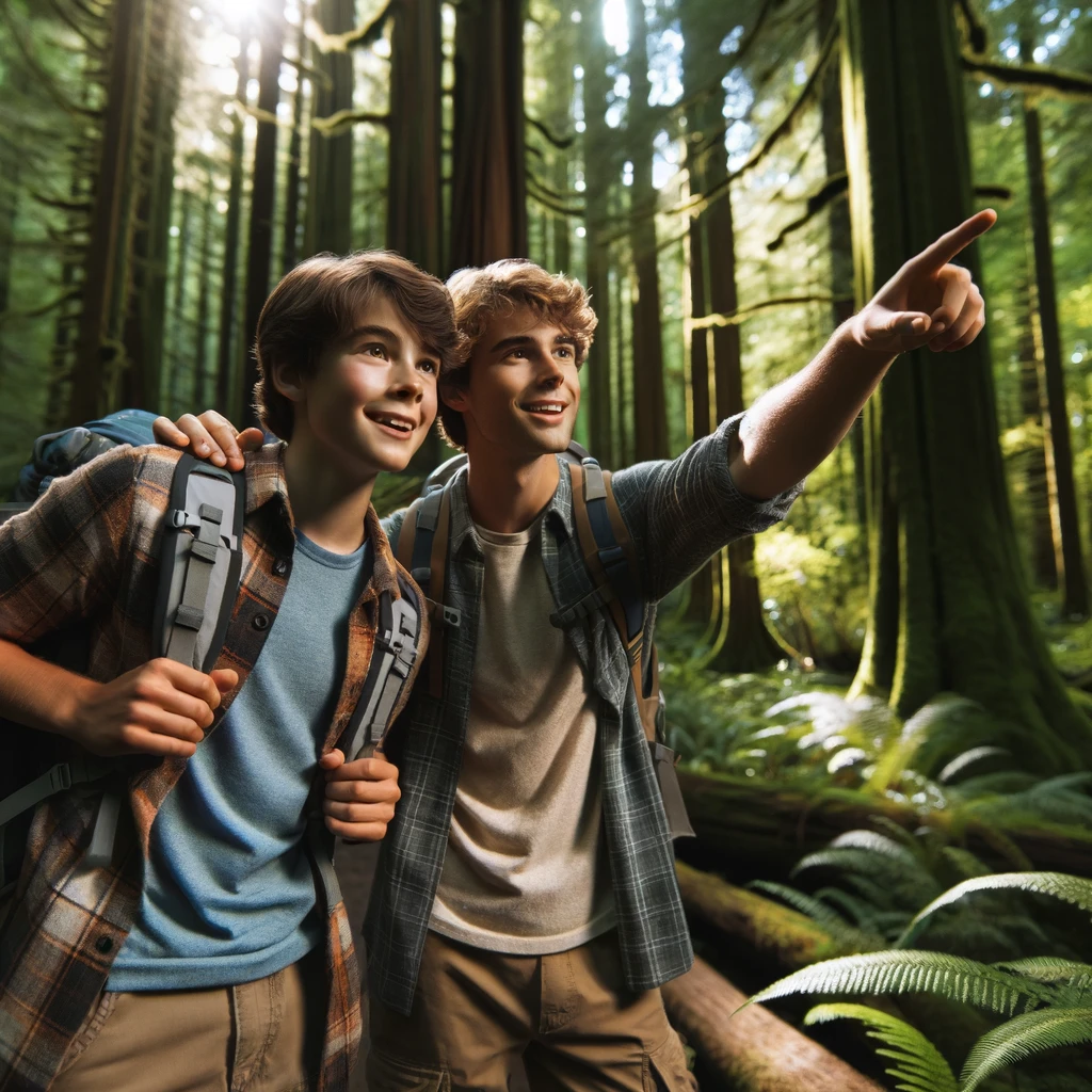 Two brothers, bound by curiosity, venture into a dense, lush forest. Towering trees loom overhead, casting dappled sunlight upon the thick underbrush. Clad in casual outdoor attire, they share a sense of adventure, eager to unravel the secrets hidden within nature’s embrace. Together, they journey into the unknown wilderness.