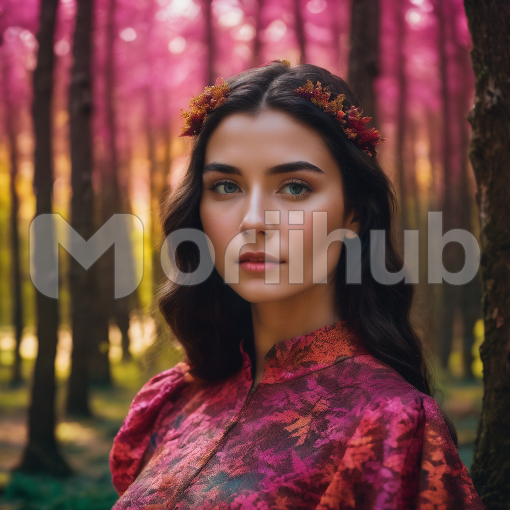 Lost in the ethereal depths of the forest, a woman stands amidst the verdant embrace of nature. Her gaze, serene and introspective, pierces through the dense foliage, as if seeking solace in the whispers of the ancient trees. The dappling sunlight paints a mosaic of light and shadow upon her features, casting an aura of tranquility around her. In this sylvan sanctuary, she finds a moment of quiet contemplation amidst the symphony of nature’s whispers.