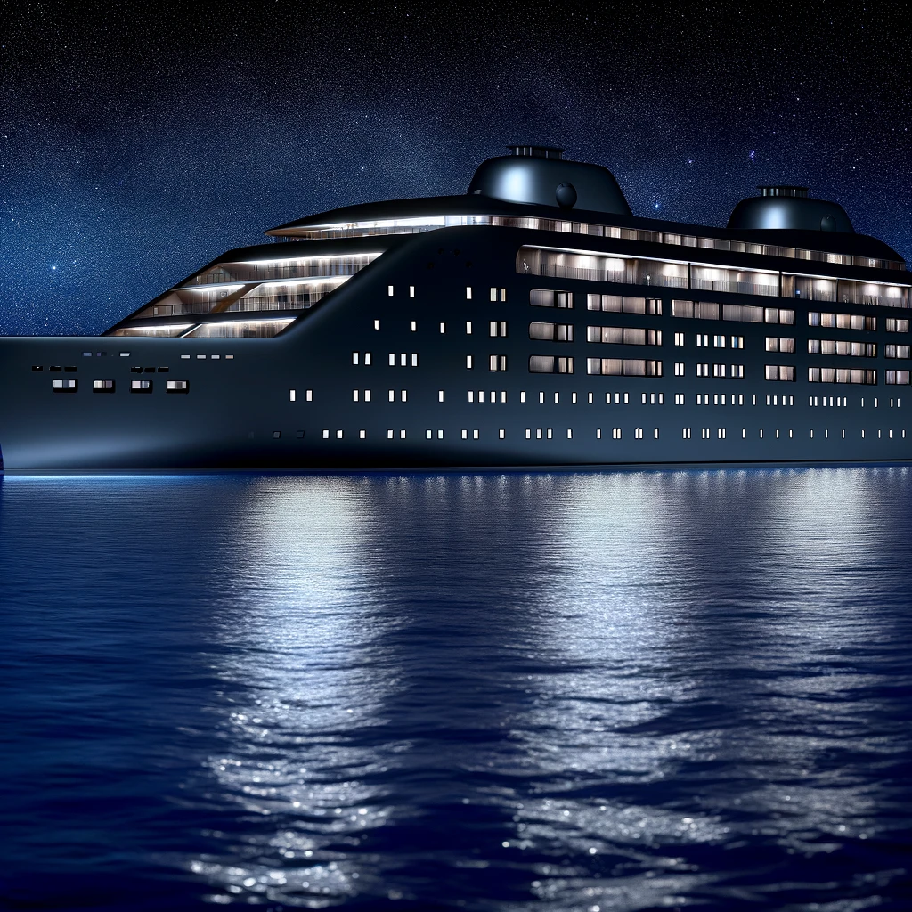 Beneath a blanket of starlight, a sleek, modern cruise ship cuts through the ocean’s expanse, its matte black hull glistening in the moon’s gentle glow. The vessel’s design is decidedly futuristic, boasting clean lines and innovative architecture that seamlessly melds form and function. As it glides gracefully through the night, it leaves behind a trail of whispers, a testament to human ingenuity navigating the boundless depths of the sea.