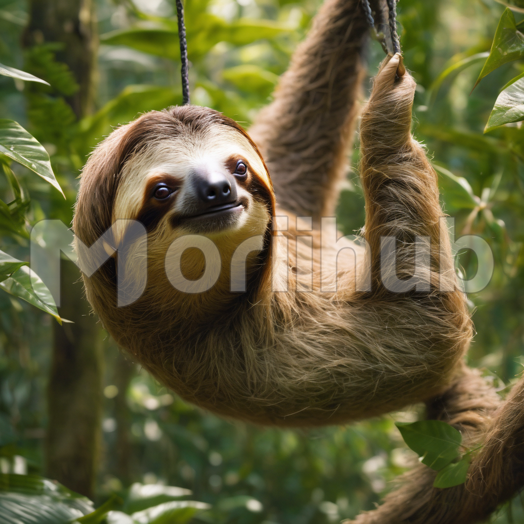 The sloth, a creature of leisure, hangs languidly from the branches, its fur a mosaic of muted hues that blend seamlessly with the rainforest canopy. Its slow, deliberate movements defy the hurried pace of the world, embodying a peaceful existence. A tranquil aura surrounds this arboreal marvel, symbolizing the unhurried beauty of nature.