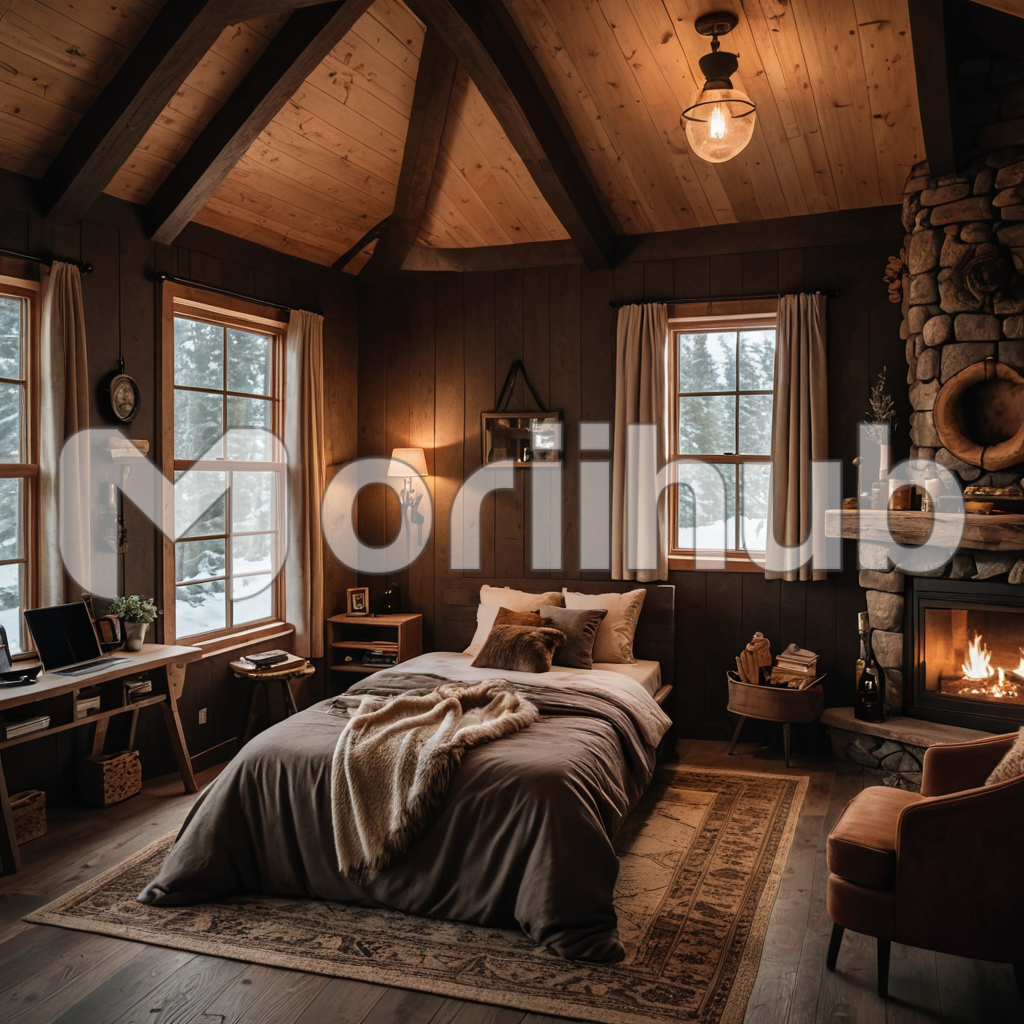 In the cozy cabin bedroom, a small bed beckons with warmth and comfort, its quilts offering a snug retreat from the winter chill. A crackling fireplace bathes the room in a soft, flickering glow, casting dancing shadows upon the rustic walls. Outside the window, a snowy landscape unfolds, serene and untouched, as far as the eye can see. The peaceful scene invites quiet reflection and contented solitude, embracing the weary traveler in the tranquil embrace of nature’s wintry beauty.