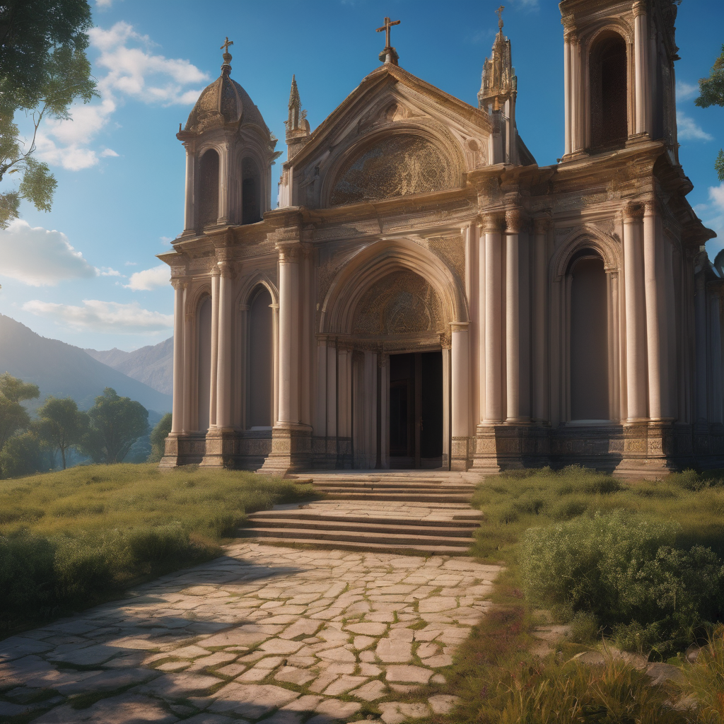 Amidst a serene landscape, an old church stands as a beacon of timeless tranquility. Its weathered facade bears the scars of time, echoing tales of bygone eras. Sparse clouds drift lazily across the sky, casting gentle shadows upon the verdant greenery that surrounds the sacred structure. In this idyllic setting, the church exudes an aura of solemn majesty, harmonizing with the natural beauty of its surroundings to create a scene of serene contemplation.