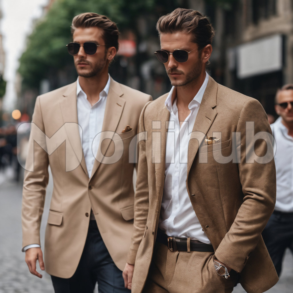 In this scene, a fashion-forward man exudes confidence and style as he walks down a sunlit street. Dressed impeccably in a tailored suit, he commands attention with every step. His sleek, modern glasses add a touch of sophistication to his appearance. The warm sunlight enhances the vibrancy of his outfit, creating a striking and memorable urban tableau. His attire and demeanor embody the epitome of sartorial elegance, making a statement of individuality amidst the bustling cityscape.