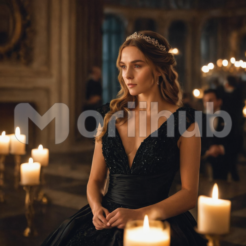 In a grand hall, an elegant woman graces the scene, adorned with a tiara and hands clasped in regal poise. The ambient glow of candles illuminates her refined presence. Behind her, a man in a sleek suit adds a touch of sophistication. The hall becomes a canvas of timeless elegance, where the woman’s poised demeanor, the glimmering tiara, and the subtle presence of a well-dressed companion create an aura of refined charm and graceful allure.