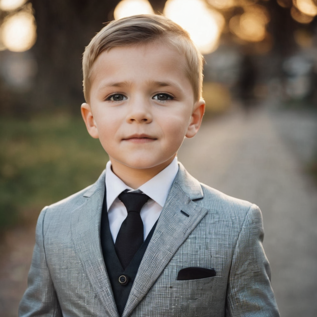 In a crisp suit tailored to fit, a little boy stands with earnestness in his gaze, his eyes fixed ahead with a blend of innocence and determination. The fabric drapes him with sophistication beyond his years, while his stance exudes a subtle confidence. Amidst the world of grown-ups, he stands as a beacon of youthful ambition, ready to embrace the adventures that lie ahead with unwavering curiosity and resolve.