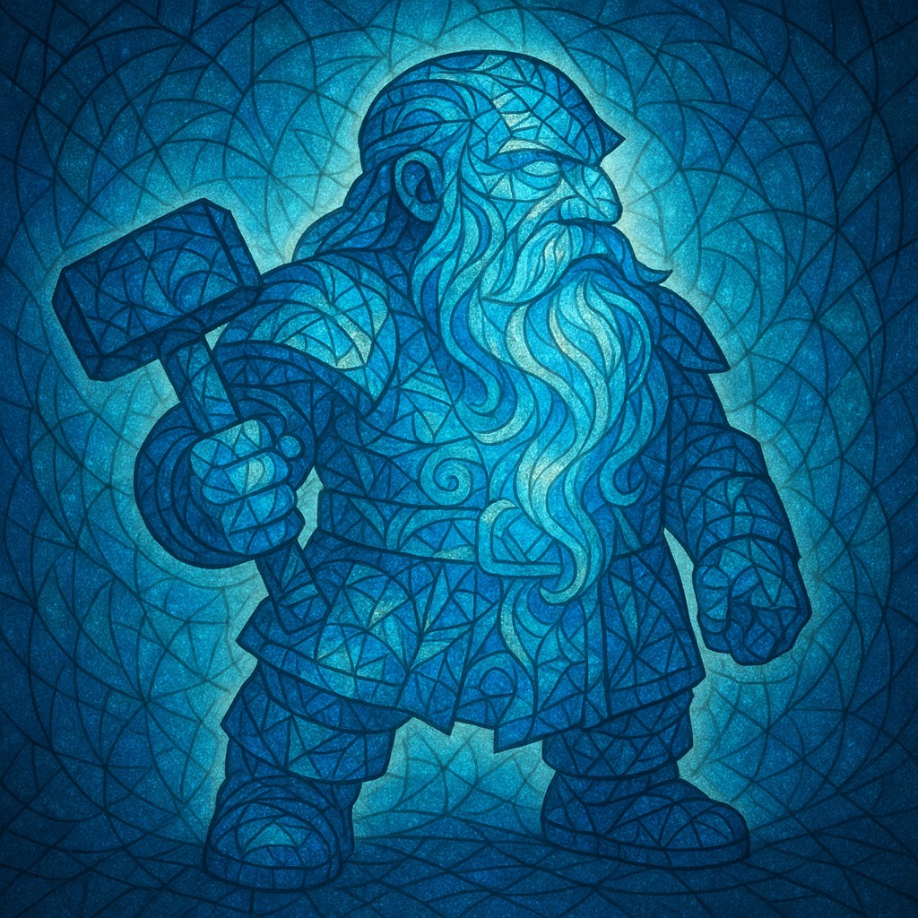 This image depicts a digital abstract mosaic of a dwarf, styled like a luminous stained-glass window. The dwarf stands in a proud, sturdy stance, holding a large square-headed hammer in one hand. His flowing beard and hair are rendered in swirling, geometric tile patterns, blending deep blues, teals, and glowing silvers that suggest an inner spiritual energy — the “soul element.”