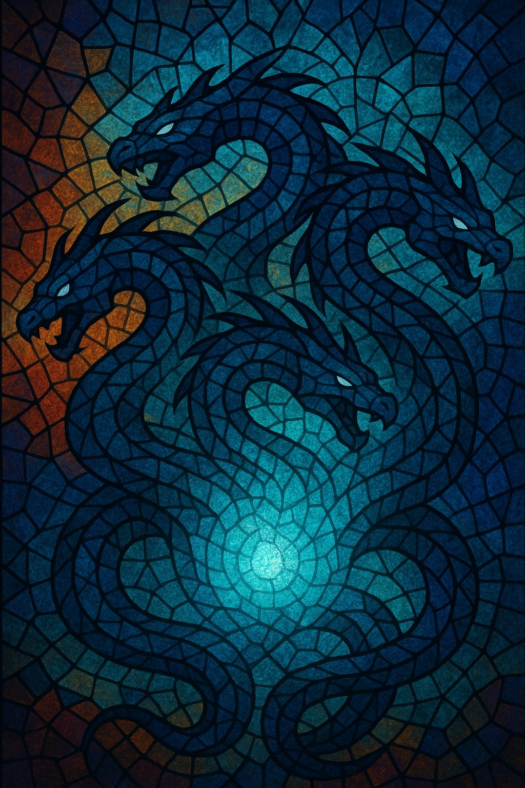 This image is a digital abstract mosaic artwork depicting a Hydra, the mythical multi-headed serpent. The creature is formed entirely from angular, stained-glass-style tiles, giving it a striking geometric and artistic appearance. The color palette features cool tones—primarily deep blues, turquoise, and hints of green—suggesting the soul element, symbolized by the glowing light at the center of the Hydra’s coiled body.