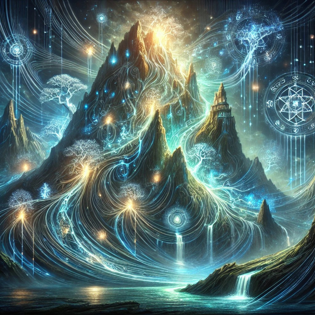 A towering mountain that seems to glow with an inner light, as if it is alive with the presence of countless souls. The mountain’s surface is covered in ethereal, glowing patterns—runes, symbols, and flowing lines that pulse softly, representing the spirits that inhabit the mountain. The air around the mountain is filled with glowing orbs and wisps of light, representing wandering souls or spiritual energy.
