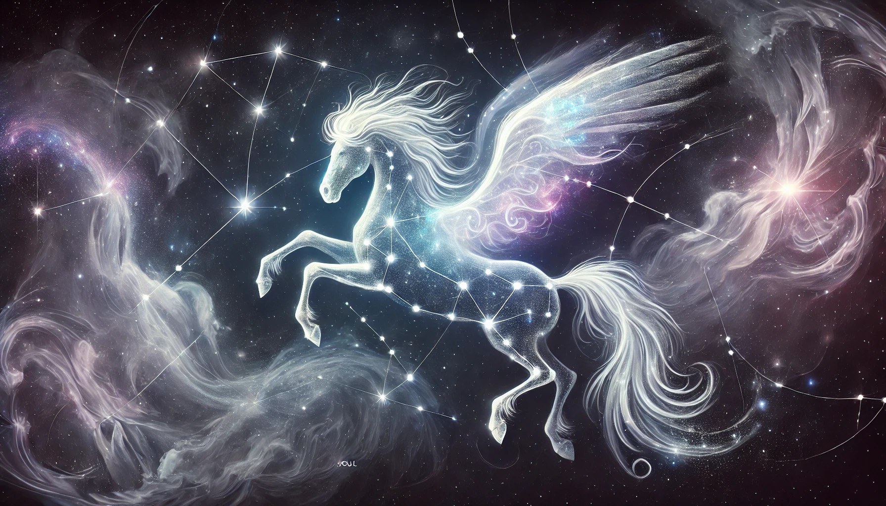 A celestial depiction of a Pegasus-shaped constellation in the night sky, the stars forming the graceful silhouette of a winged Pegasus in mid-flight.