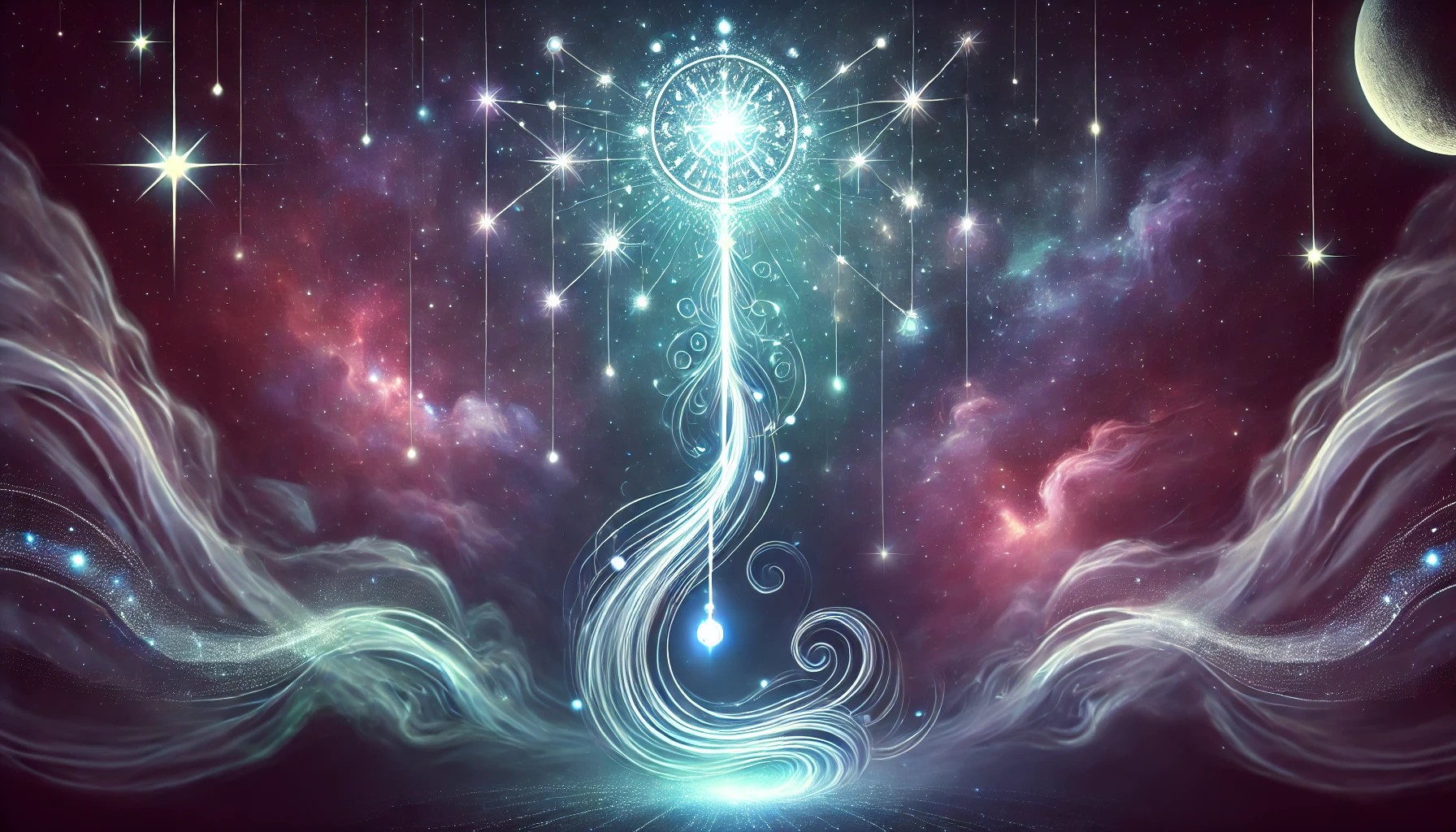 The image portrays a glowing constellation in the shape of a mystical scepter floating gracefully in the cosmic night sky. The scepter’s elegant shaft is formed by shimmering stars connected with glowing lines of light, leading to a radiant orb at the top that symbolizes concentrated soul energy. Surrounding the scepter, wisps of ethereal mist flow gently in soft purple, teal, and silver hues, resembling spiritual energy or drifting soul currents.