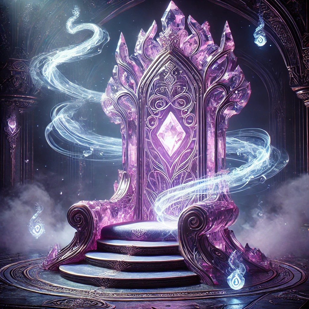 A majestic throne of translucent crystal, radiating the ethereal power of the soul element. Crafted from deep violet and amethyst crystals, the throne gleams with a mystical glow, its surfaces smooth yet intricately carved with ancient soul runes. These glowing runes pulse softly, channeling streams of spectral energy through the throne’s structure.