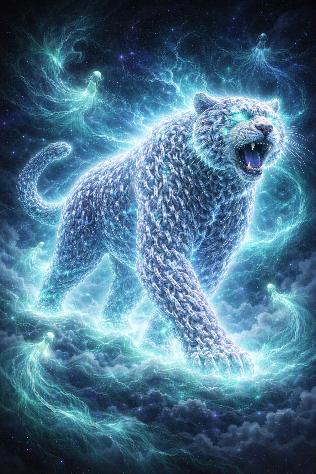 The image depicts a magnificent tiger made entirely of shimmering, interwoven chains that pulse with a soul-stirring energy. The chains, glowing in ethereal shades of blue and turquoise, seem to vibrate with life, as if the very essence of the tiger is powered by a spectral force. Its body trails ghostly wisps and glowing, ethereal flames, adding to the otherworldly presence.