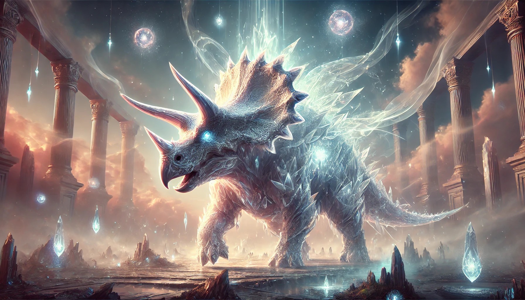 This artwork portrays a majestic Crystal Triceratops, infused with the soul element, standing in an ethereal, mystical realm. Its body is composed of translucent crystal shards that shimmer with an otherworldly glow, refracting soft, spectral light. The Triceratops’ eyes radiate a ghostly luminescence, exuding an aura of ancient wisdom and spiritual energy. Its massive crystalline horns, elegantly curved and glowing, seem to channel the very essence of the soul element.