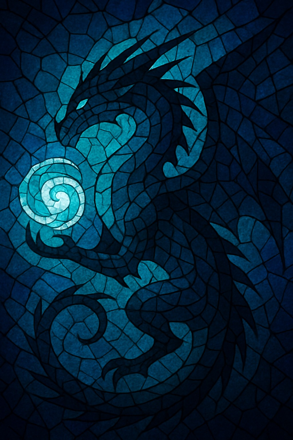 This image is a digital abstract mosaic depicting a western dragon. The dragon is rendered in a stained-glass style, composed of irregular geometric tiles—hexagons, pentagons, and other polygons. The color palette centers around deep blues, teals, purples, and turquoise, creating a mystical, ethereal effect. The dragon is shown in profile, coiled in an elegant S-curve with wings spread. It holds a glowing, swirling orb of light in one claw, symbolizing the “soul element.”