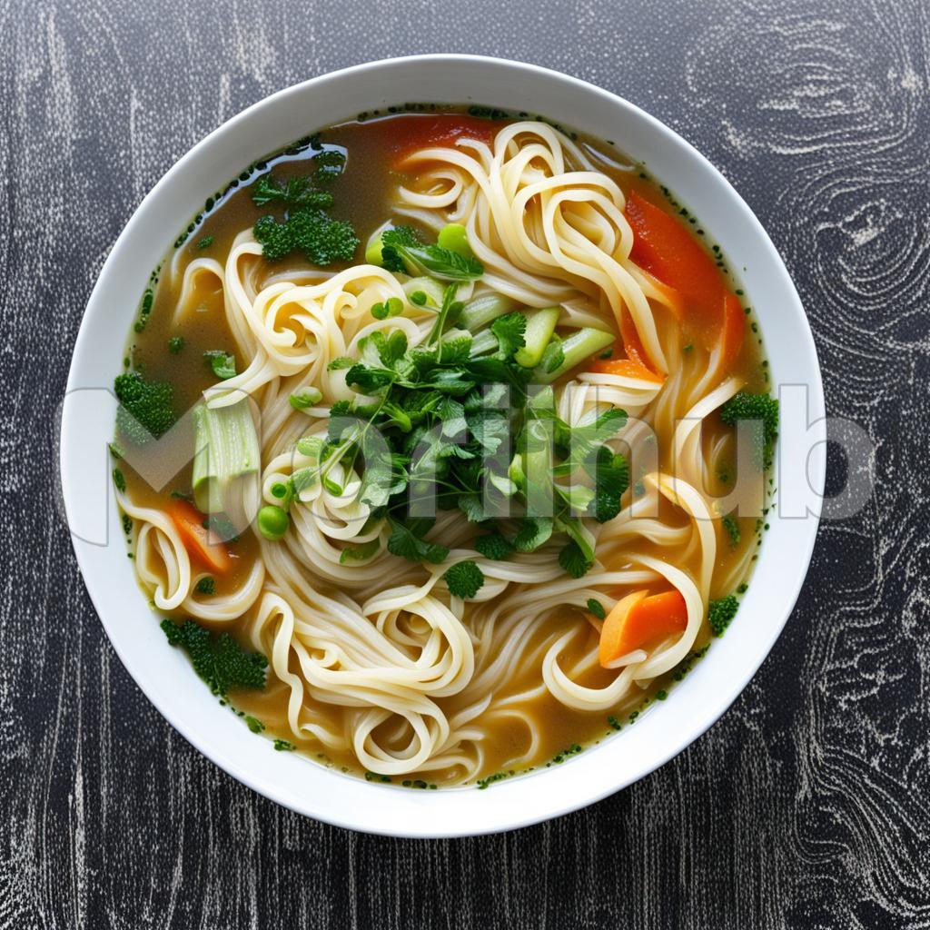A steaming bowl of noodle soup beckons on the table, an aromatic masterpiece that tantalizes the senses. Thin strands of noodles intertwine with vibrant vegetables, submerged in a rich, savory broth. Fragrant steam rises, carrying the essence of carefully blended spices. The table setting frames the bowl, offering a cozy invitation to savor each spoonful. This simple yet hearty dish epitomizes comfort, inviting a symphony of flavors and warmth in every delightful slurp.