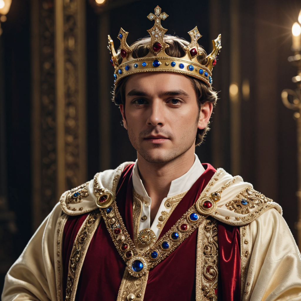 Clad in a majestic robe, a man dons a crown that signifies his sovereignty. The golden circlet rests upon his brow, its precious gems glinting with regal allure. His royal robe cascades in luxurious folds, a symbol of his esteemed position. With dignified grace, he embodies the embodiment of authority and nobility. In his presence, there is an aura of reverence and power, a testament to the legacy of kingship that he upholds.